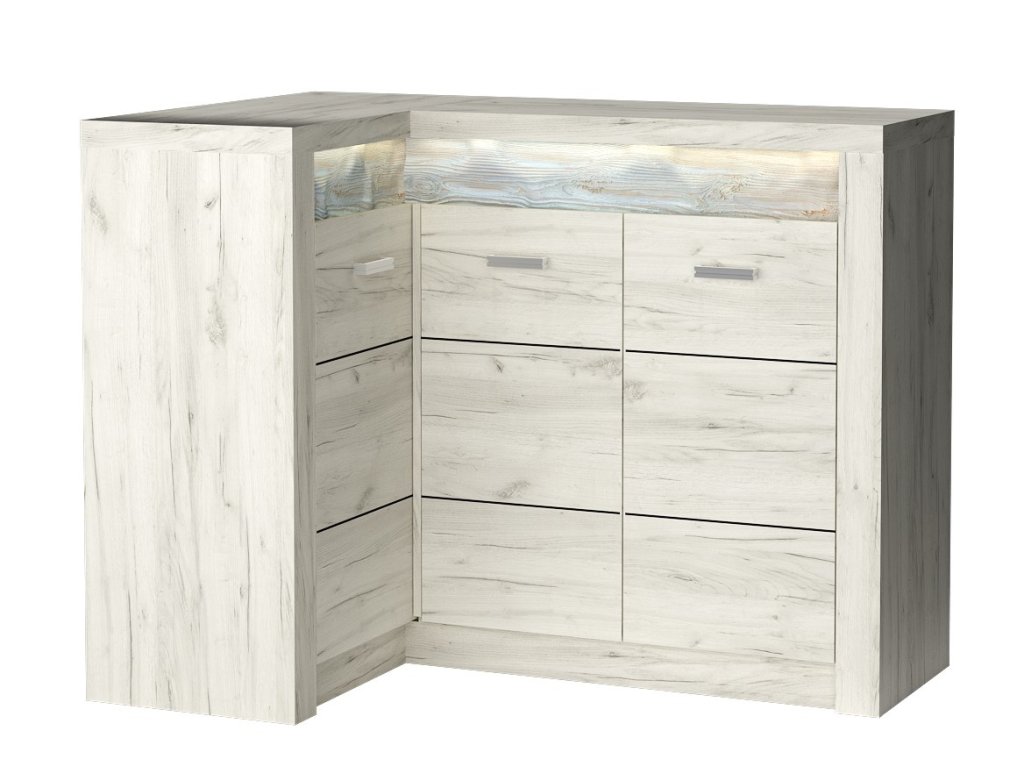 Rohová komoda s rohem nalevo. Roh nalevo znamená na levé straně jsou 1 dvířka, na pravé 2 dvířka. Možnost objednání i opačné verze. Rozměry viz perokresba. Systém je exkluzivní kolekce navržena v moderním duchu. Vsazením LED osvětlení do ozdobné rýhované lišty, které najdete v naší další nabídce k dokoupení, je zvýrazněn rustikální vzhled masivního dřeva. Celá řada se vyznačuje elegancí a jednoduchými tvary, které zaručují plné využití prostoru. Nábytek je vyroben z kvalitního lamina s ABS hrany ( 0,5-0,8 mm ). Barevné provedení jasan bílý. Dodáváme v demontovaném stavu.