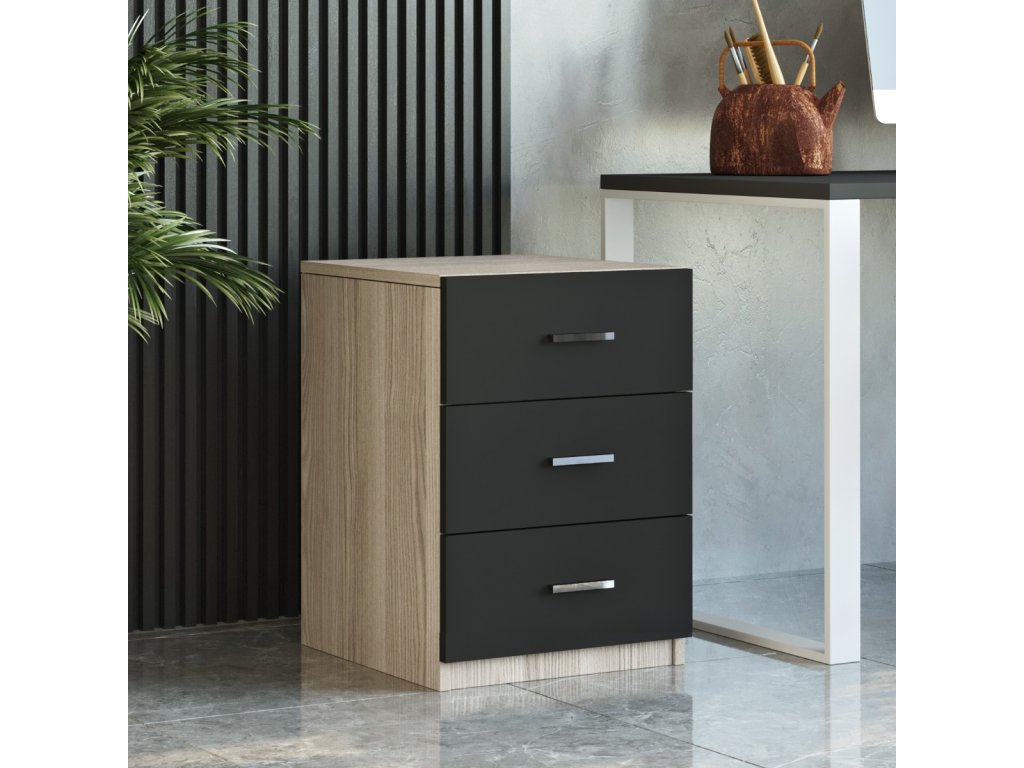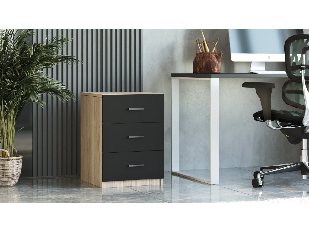 Potěšte se moderním designem komody, která vyniká kombinací dubového odstínu s černými prvky. Tento kontrastní vzhled zaručuje, že komoda bude skutečným skvostem ve vašem interiéru. K tomu přidáváme vysokou úroveň funkčnosti díky třem zásuvkám, které poskytují dostatek prostoru pro ukládání důležitých dokumentů nebo kancelářských potřeb.