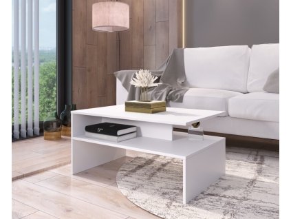 šířka: 60 cm | výška: 42 cm Konferenční stolek s policí je vyroben z desky MDF v barvě bílá, nožky jsou z masivu borovice. Dodáváme v demontovaném stavu.