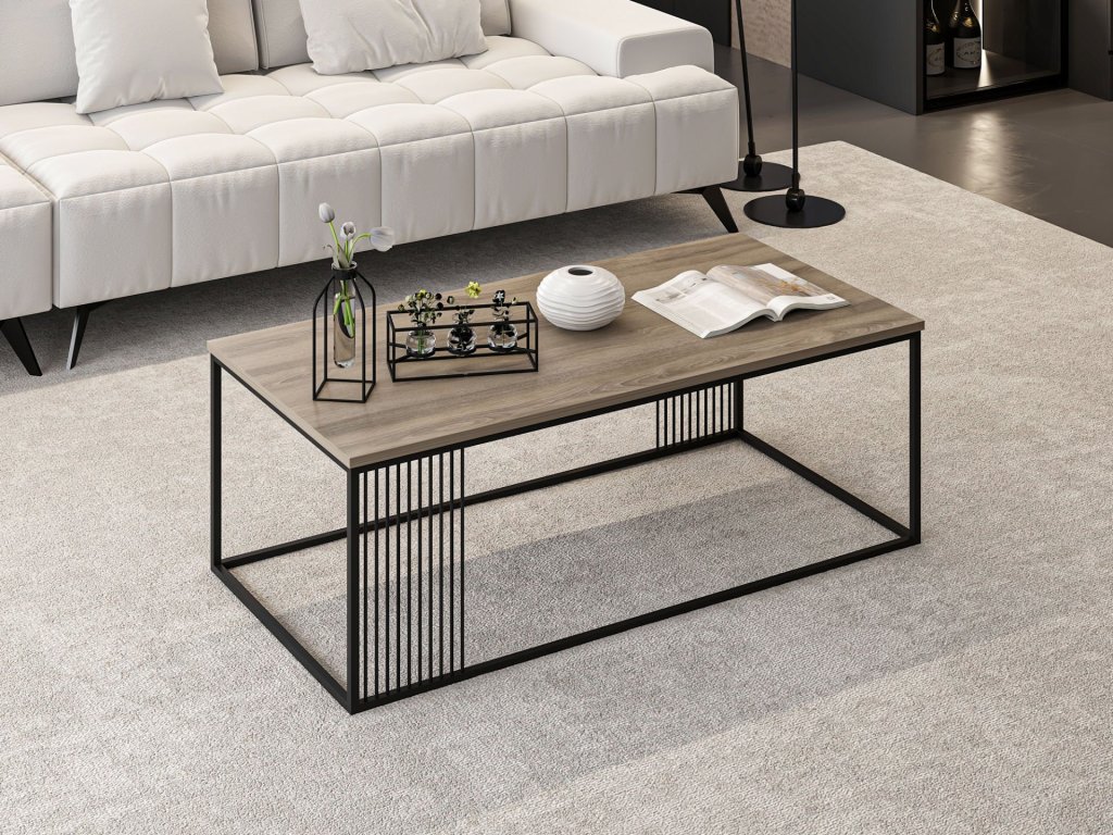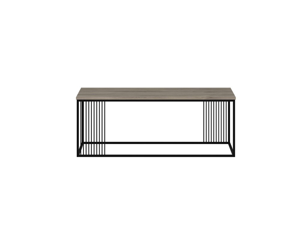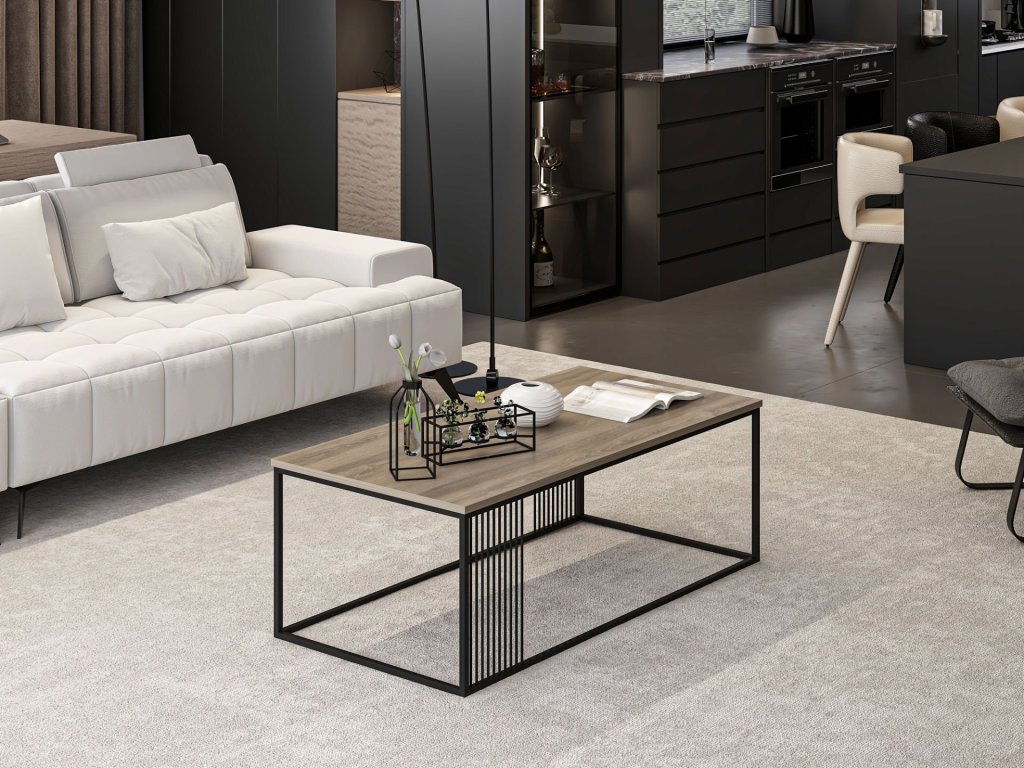 šířka: 110 cm | výška: 45 cm | hloubka: 60 cm Konferenční stolek přinese do Vašeho domova trochu industriálního šarmu. Obdélníkovou desku z MDF v dekoru divoký dub harmonicky...
