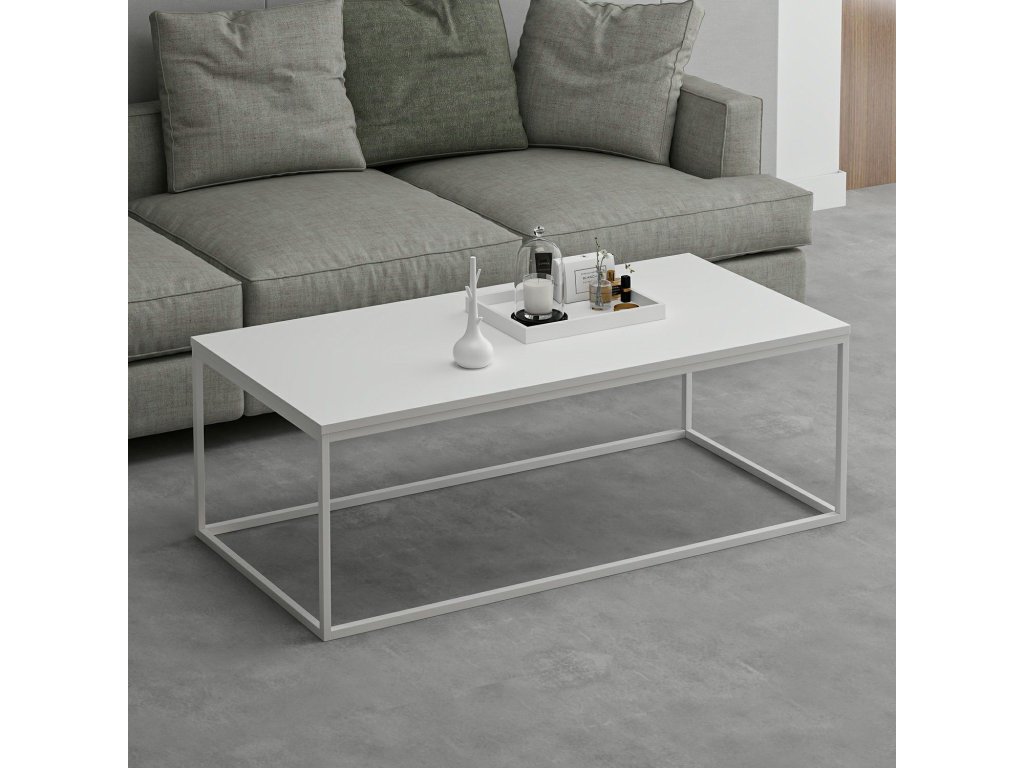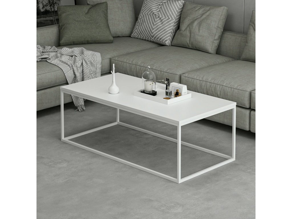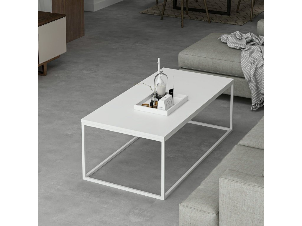 Konferenční stolek přináší jednoduchý a stylový design inspirovaný skandinávským stylem. Jeho široký obdélníkový tvar, bílá barva a kovové nohy z něj dělají ideální doplněk do moderních a útulných interiérů. Stolek nabízí dostatek prostoru pro dekorace, občerstvení nebo oblíbené knihy.