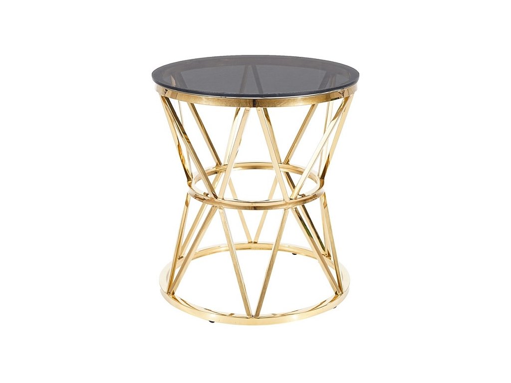 Konferenční stolek v moderním stylu glamour. Konstrukce je z kovu ve zlaté barvě, vrchní deska je z tvrzeného kouřového skla. Tento stylový kousek v netradičním designu se bude vyjímat v každém interiéru. Dodáváme v demontovaném stavu.Doplňkové parametry