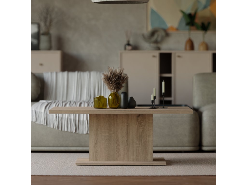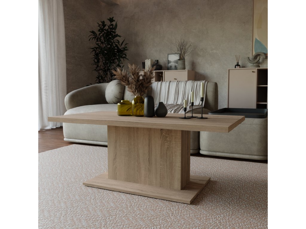 Konferenční stolek Denis je atraktivní stolek, který je vyrobený z lamina ve velmi oblíbeném a moderním dekoru dub sonoma. Stolek je dostatečně velký na vše, co si budete potřebovat odložit. Hrnek s kávou nebo čajem, talíř, knihu, telefon, notebook, nebo klidně i unavené nohy po celodenním maratonu. Stolek je dodávaný v demontu. Součástí balení je montážní plánek včetně všech potřebných spojovacích materiálů. Vyobrazené doplňky a dekorace nejsou v ceně.