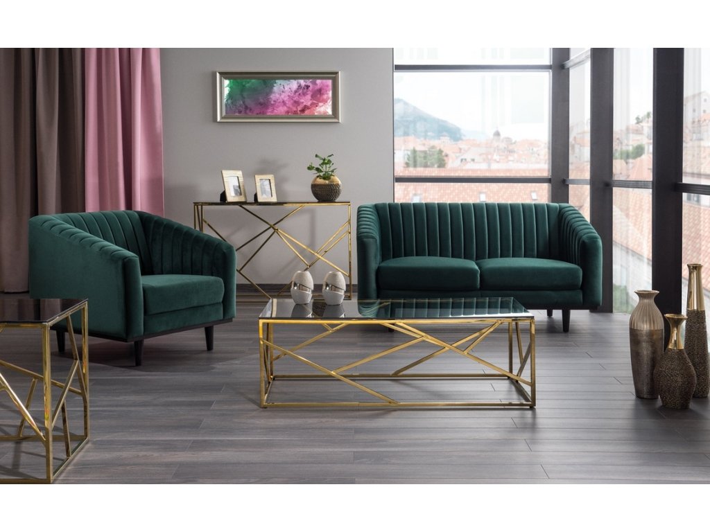 šířka: 42 cm | výška: 48 cm | hloubka: 42 cm Konferenční stolek v moderním stylu glamour. Konstrukce je z kovu ve zlaté barvě, deska stolku je z tvrzeného skla v barvě černé....