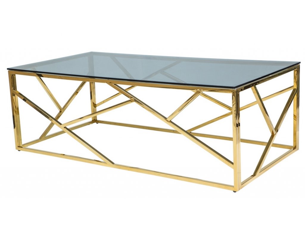 Konferenční stolek v moderním stylu glamour. Konstrukce je z kovu ve zlaté barvě, vrchní deska je z tvrzeného kouřového skla. Tento stylový kousek v netradičním designu se bude vyjímat v každém interiéru. Dodáváme v demontovaném stavu.Doplňkové parametry