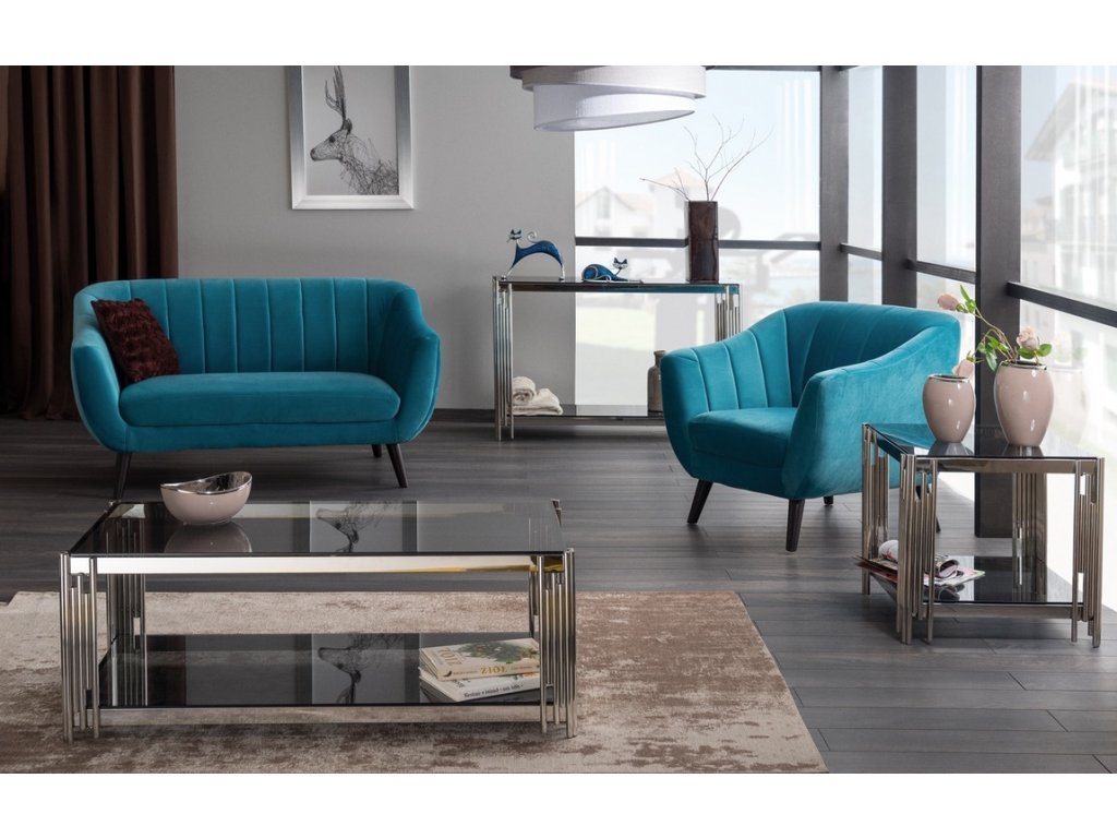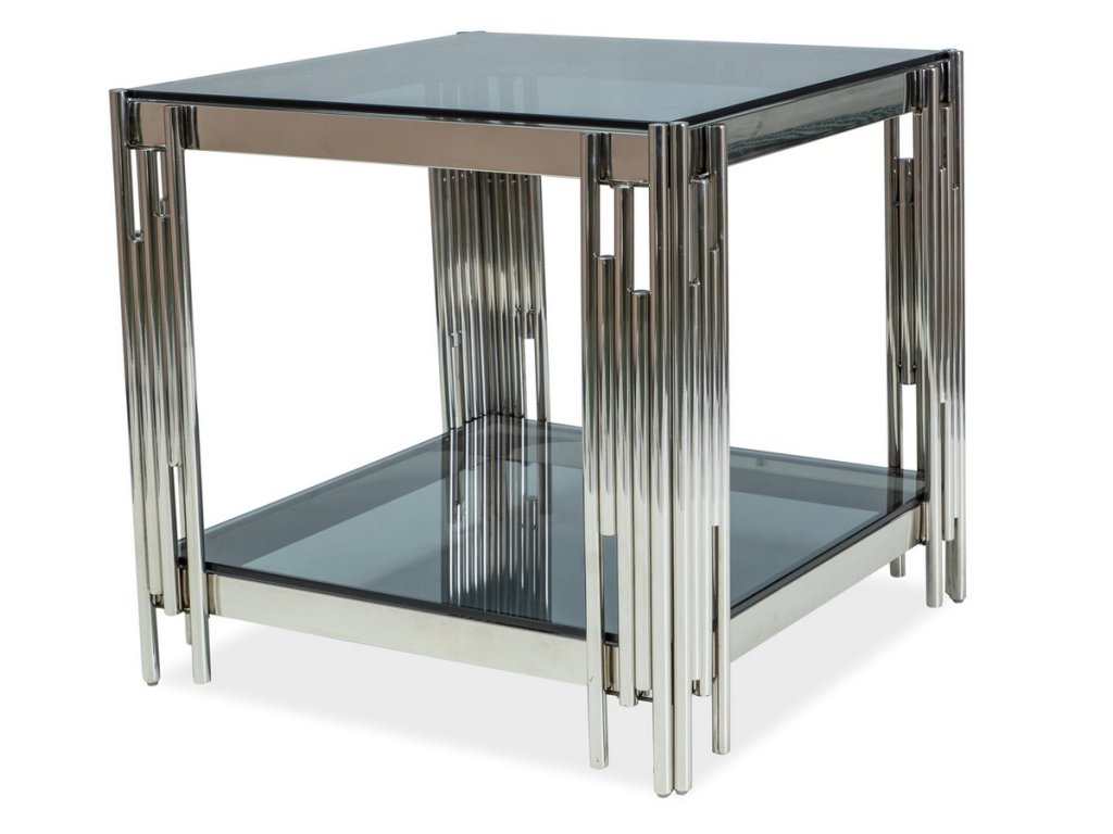 Konferenční stolek v moderním stylu glamour. Konstrukce je z kovu v barvě chróm, odkládací desky jsou z tvrzeného kouřového skla. Tento stylový kousek v netradičním designu se bude vyjímat v každém interiéru. Dodáváme v demontovaném stavu.Doplňkové parametry