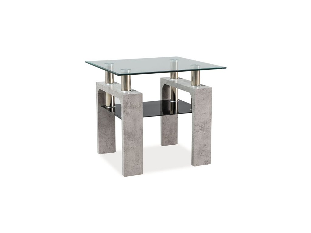 Stylový konferenční stolek v moderním provedení. Konstrukce je z MDF v barvě betonu, v kombinaci s pochromovaným kovem. Vrchní deska je z čirého tvrzeného skla, polička je z černého skla. Tento stolek je v nabídce také v jiných barevných provedeních.Doplňkové parametry