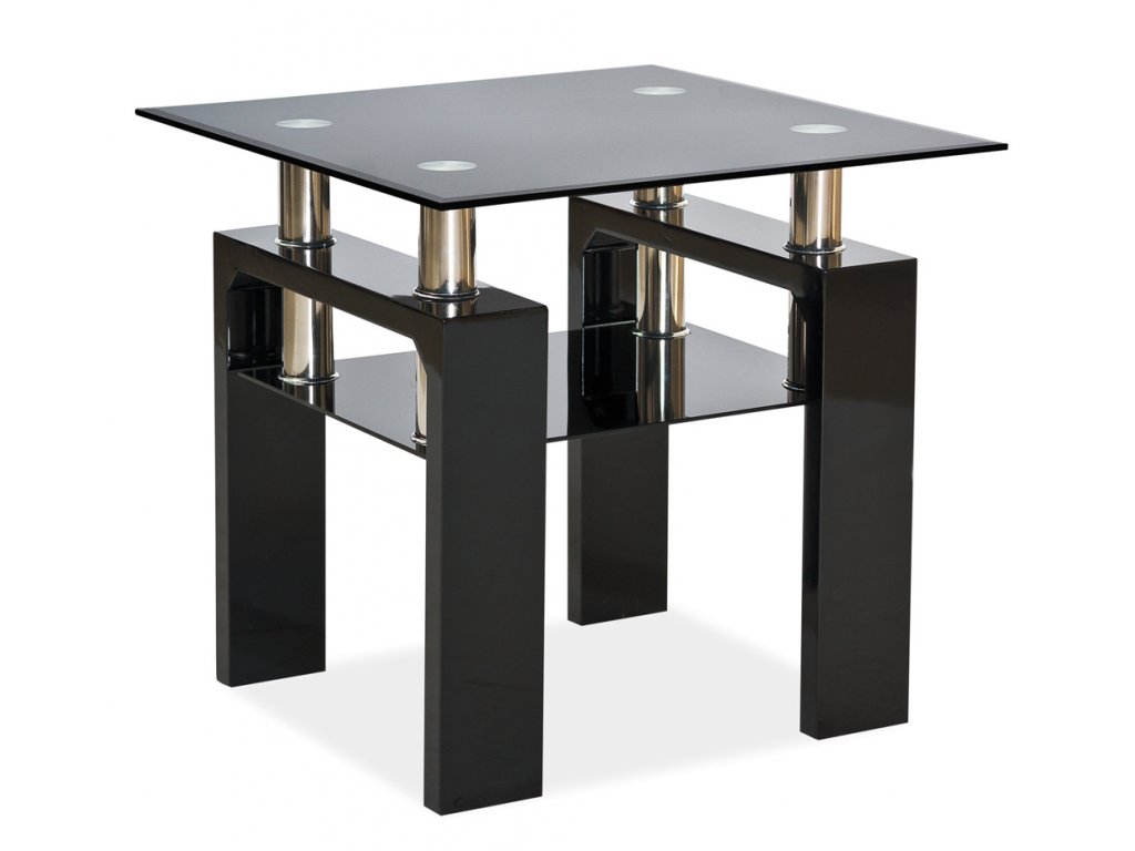 Stylový konferenční stolek v moderním provedení. Konstrukce je z MDF v černé lakované barvě, vrchní deska i polička je z černého tvrzeného skla. Polička je zachycena na kovových částech. Nabízíme tento stolek i v jiných barevných provedení, vše i s ostatními výrobky kolekce LISA naleznete v naší nabídce.Doplňkové parametry