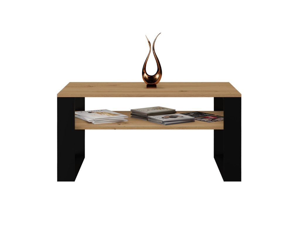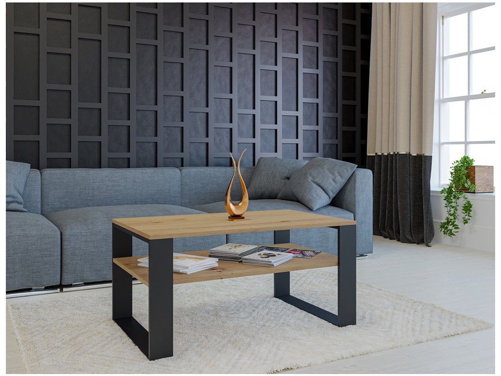 šířka: 110 cm | výška: 44 cm | hloubka: 60 cm Konferenční stolek s rozměry 110x60x42 cm kombinuje desku z MDF s dekorem divokého dubu a pevné nohy z černě matného kovu. Deska...