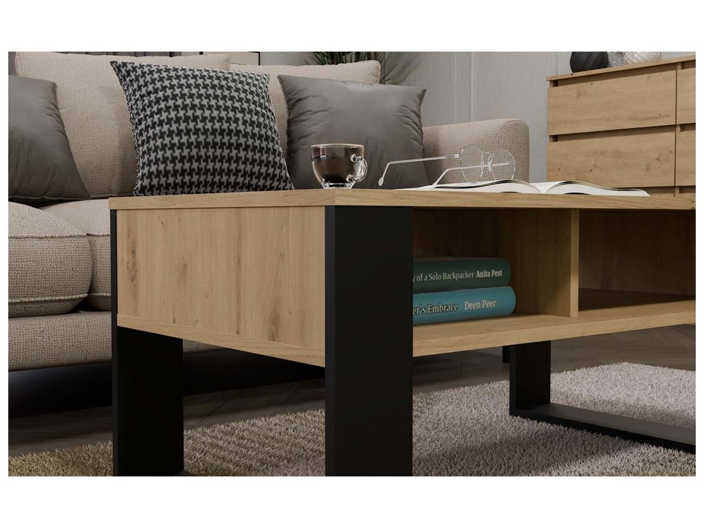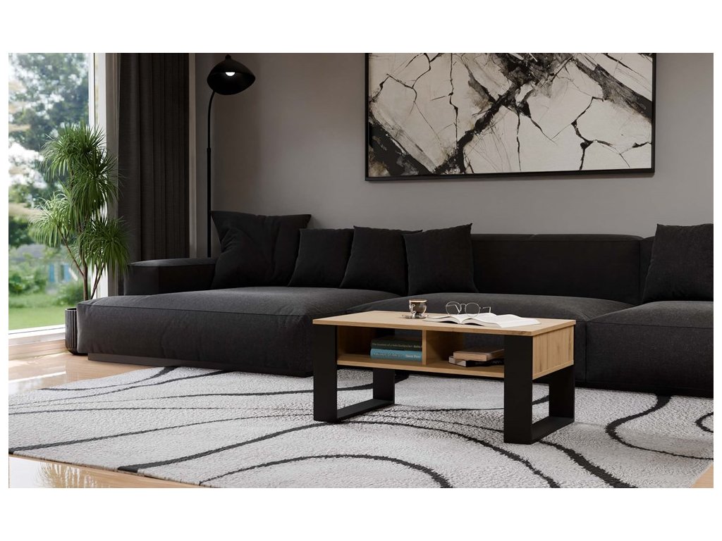 šířka: 110 cm | výška: 45 cm | hloubka: 60 cm Konferenční stolek přinese do Vašeho domova trochu industriálního šarmu. Obdélníkovou desku z MDF v dekoru divoký dub harmonicky...