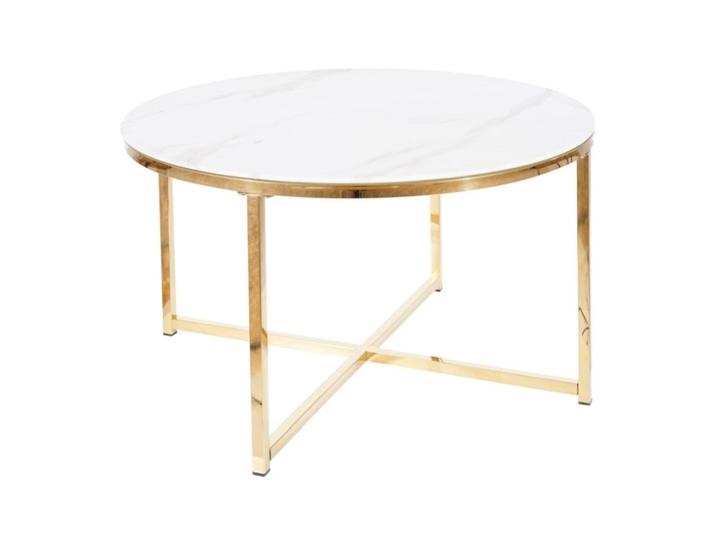Konferenční stolek v moderním stylu glamour. Konstrukce je z kovu ve zlaté barvě, vrchní deska je z tvrzeného skla s efektem bílého mramoru. Tento stylový kousek v netradičním designu se bude vyjímat v každém interiéru. Dodáváme v demontovaném stavu.Doplňkové parametry