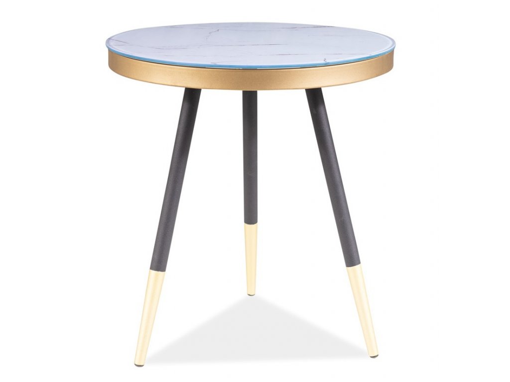 Konferenční stolek v moderním stylu glamour. Konstrukce je z kovu v černé barvě se zlatými detaily, deska stolku je z přírodní dýhy a tvrzeného skla s efektem bílého mramoru. Tento stylový kousek v moderním designu se bude vyjímat v každém interiéru. Dodáváme v demontovaném stavu.Doplňkové parametry