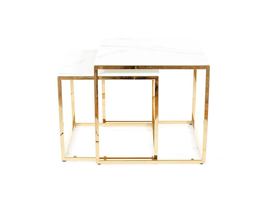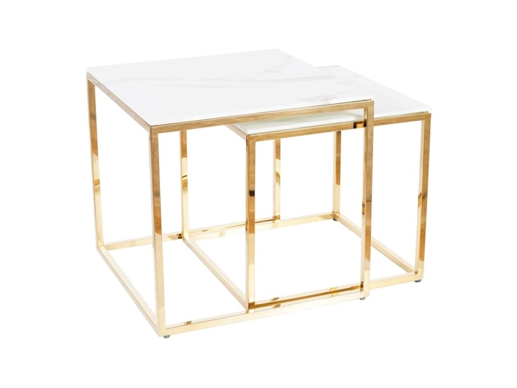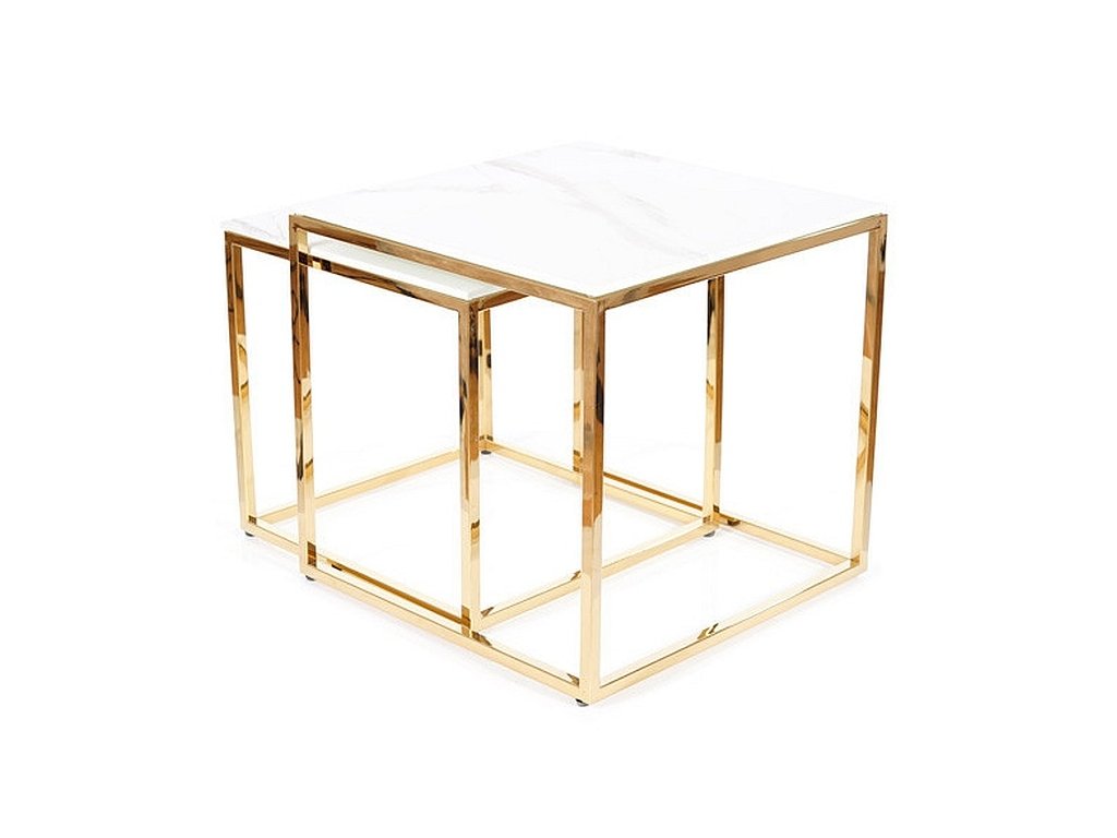 Sada dvou konferenčních stolků v moderním stylu glamour. Konstrukce je z kovu ve zlaté barvě, vrchní deska je z tvrzeného skla s efektem bílého mramoru. Tento stylový kousek v netradičním designu se bude vyjímat v každém interiéru. Rozměry většího stolku jsou 45x45x43 cm, rozměry menšího 40x40x38 cm.Doplňkové parametry