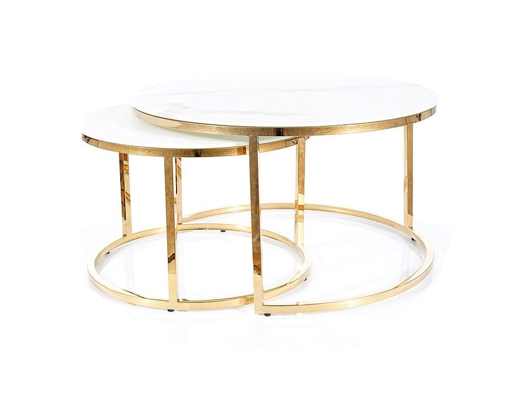 Sada dvou kulatých konferenčních stolků v moderním stylu glamour. Konstrukce je z kovu ve zlaté barvě, vrchní deska je z tvrzeného skla s efektem bílého mramoru. Tento stylový kousek v netradičním designu se bude vyjímat v každém interiéru. Dodáváme v demontovaném stavu. Rozměry většího stolku jsou 80x80x45 cm, rozměry menšího 60x60x40 cm.Doplňkové parametry