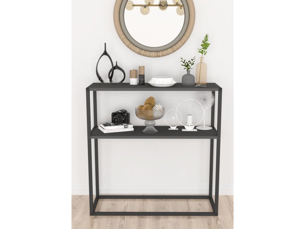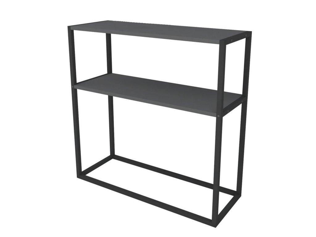 Konzolový stolek - regál je z kovového rámu v matné černé barvě a odkládací deska je vyrobena z kvalitní LTD desky v barvě antracit. Dodáváme v demontovaném stavu.Doplňkové parametry
