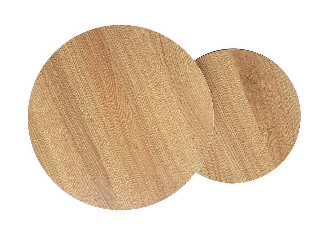 Sada konferenčních stolků 2 ks v moderním stylu. Konstrukce je z kovu matné černé barvy, vrchní deska je z kvalitní LTD desky v barvě dub. Tento stylový kousek v jednoduchém designu se bude vyjímat v každém interiéru. Rozměry většího stolku jsou 45x45x48 cm, rozměry menšího 32x32x42 cm. Dodáváme v demontovaném stavu.Doplňkové parametry