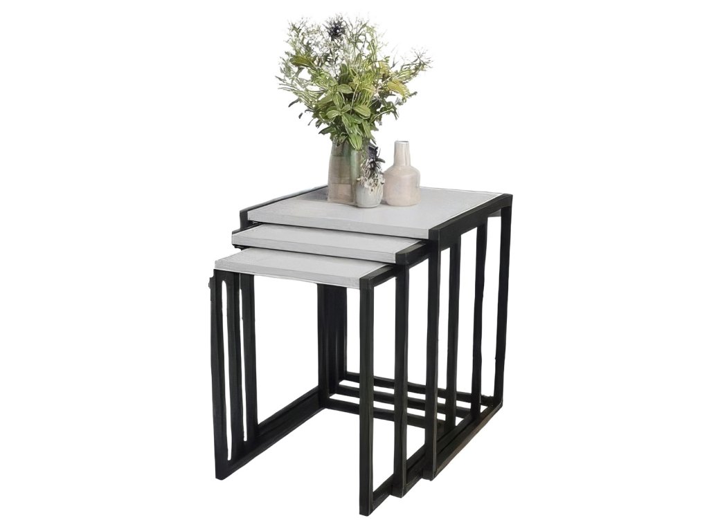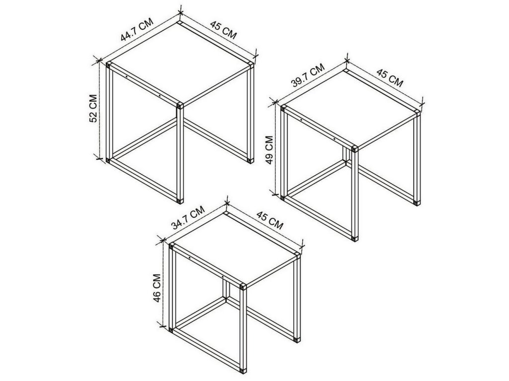 Sada konferenčních stolků je v jednoduchém a stylovém provedení. Desky jsou vyrobeny z kvalitního LTD materiálu v barevném provedení bílá. Jednoduše se udržují. Konstrukce je kovová, natřená elektrostatickou práškovou barvou odolnou vůči rzi a poškrábání. V ceně jsou tři konferenční stolky. Rozměry stolků: 1. stolek: - šířka 35 cm - hloubka 45 cm - výška 46 cm 2. stolek: - šířka 40 cm - hloubka 45 cm - výška 49 cm 3. stolek: - šířka 45 cm - hloubka 45 cm - výška 52 cm Dodáváme v demontovaném stavu.Doplňkové parametry