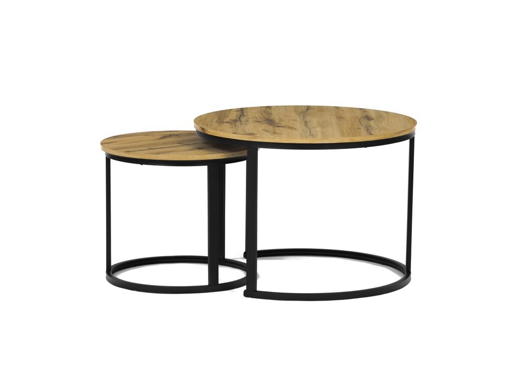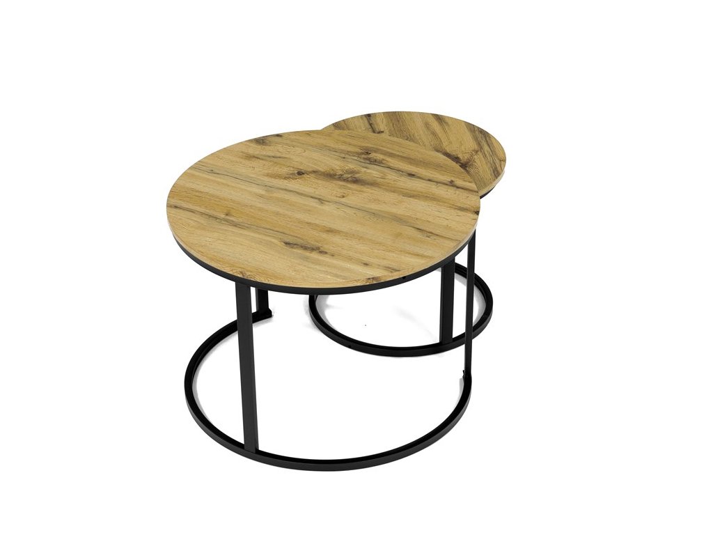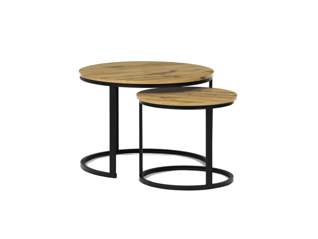 Konferenční stoly v setu dvou kusů kombinují desky z MDF s dekorem divokého dubu a pevnou kovovou podnož v černém matném laku. Kulaté desky s přírodními hnědými odstíny jsou navrženy s ohledem na snadnou údržbu a odolnost proti poškrábání. Kovová podnož tvoří stabilní kruhový rám, který zajišťuje pevnost a stabilitu stolů. Výška většího stolu je 50 cm, což umožňuje pohodlné použití v obývacím prostoru jako praktický doplněk k sedací soupravě. Menší stůl lze díky kompaktním rozměrům snadno zasunout pod větší, čímž šetří místo a nabízí variabilní uspořádání.