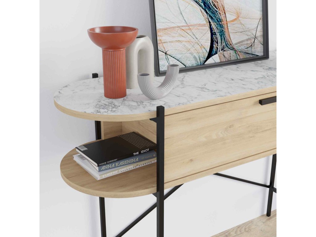 Vnesete do svého interiéru nádech modernosti s LUNA, konzolovým stolem, který kombinuje teplý dub s luxusní bílou Carrara. Tento stolek je ideální pro obývací pokoj i předsíň, kde se stane dominantním a stylovým prvkem.