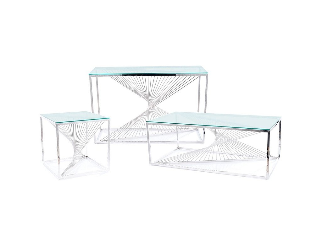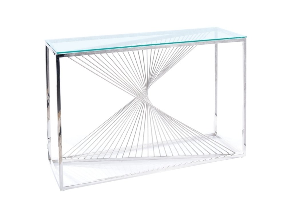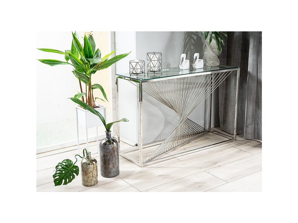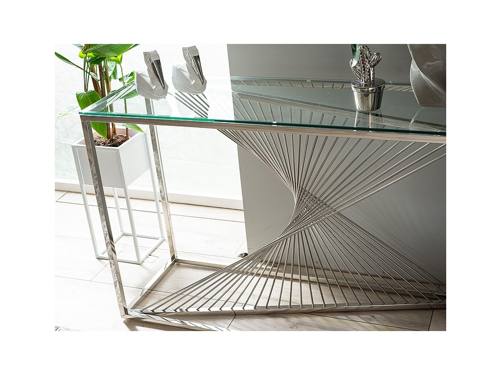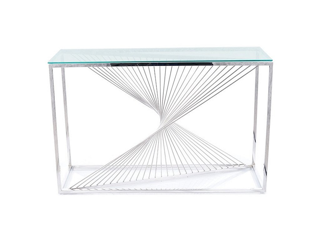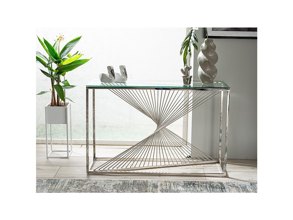 Konzolový stolek v moderním stylu glamour. Konstrukce je z nerezové oceli ve stříbrné barvě, vrchní deska je z tvrzeného skla. Tento stylový kousek v netradičním designu se bude vyjímat v každém interiéru. Dodáváme v demontovaném stavu.Doplňkové parametry