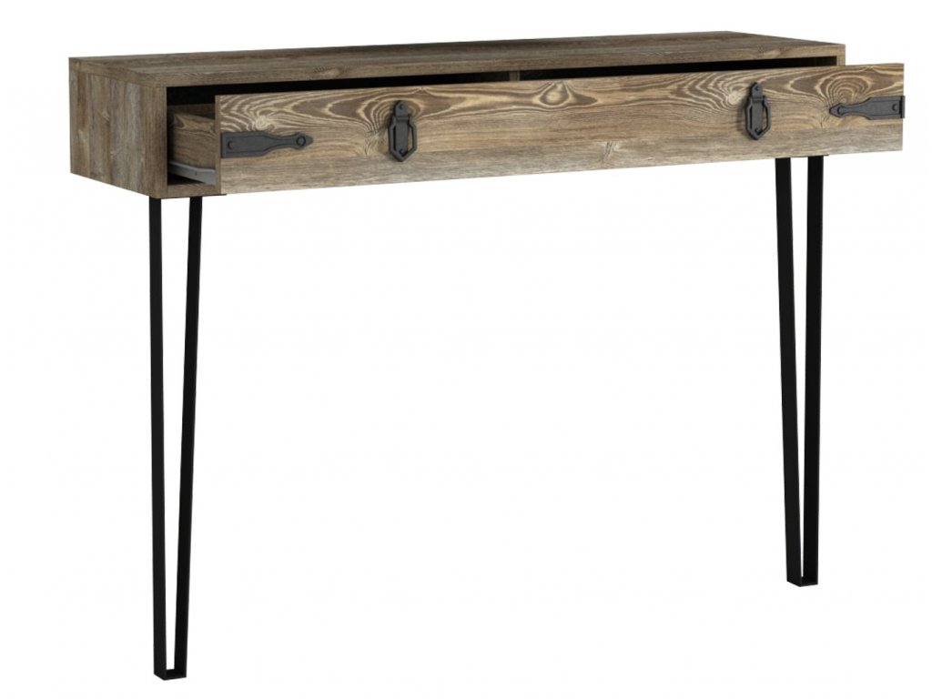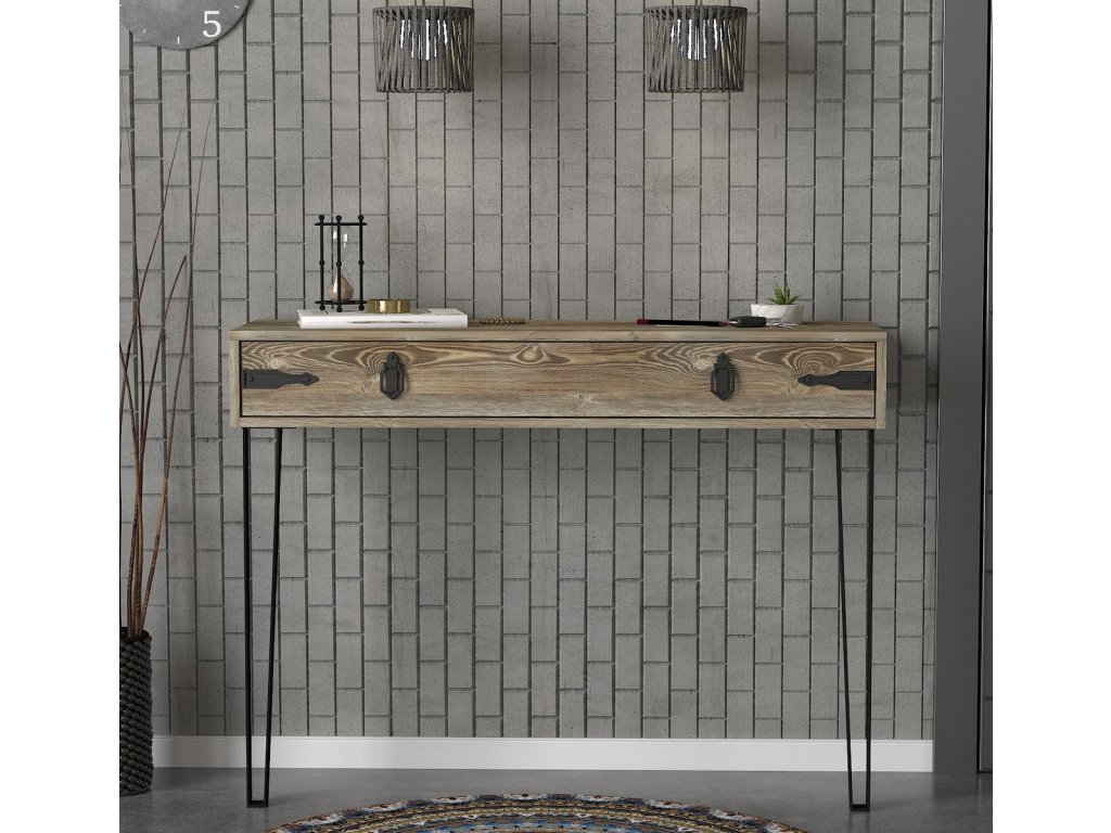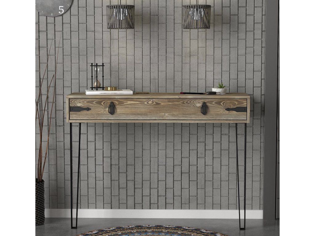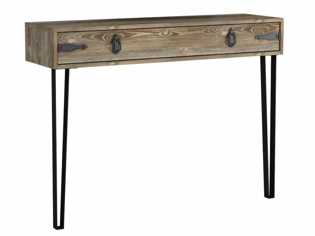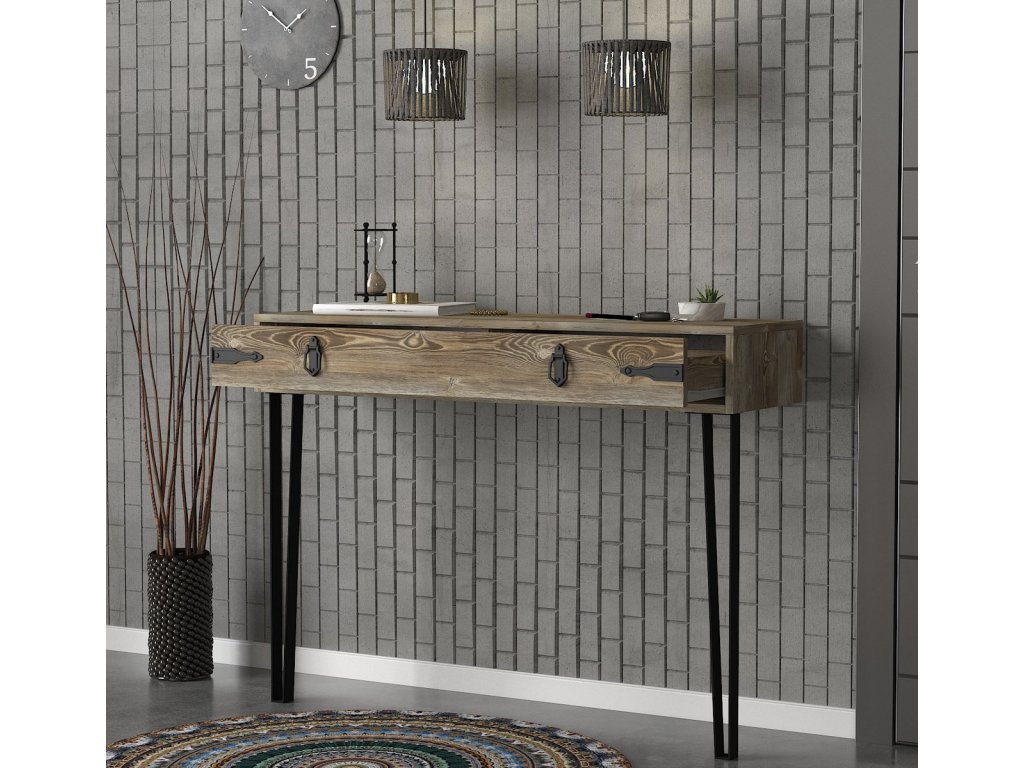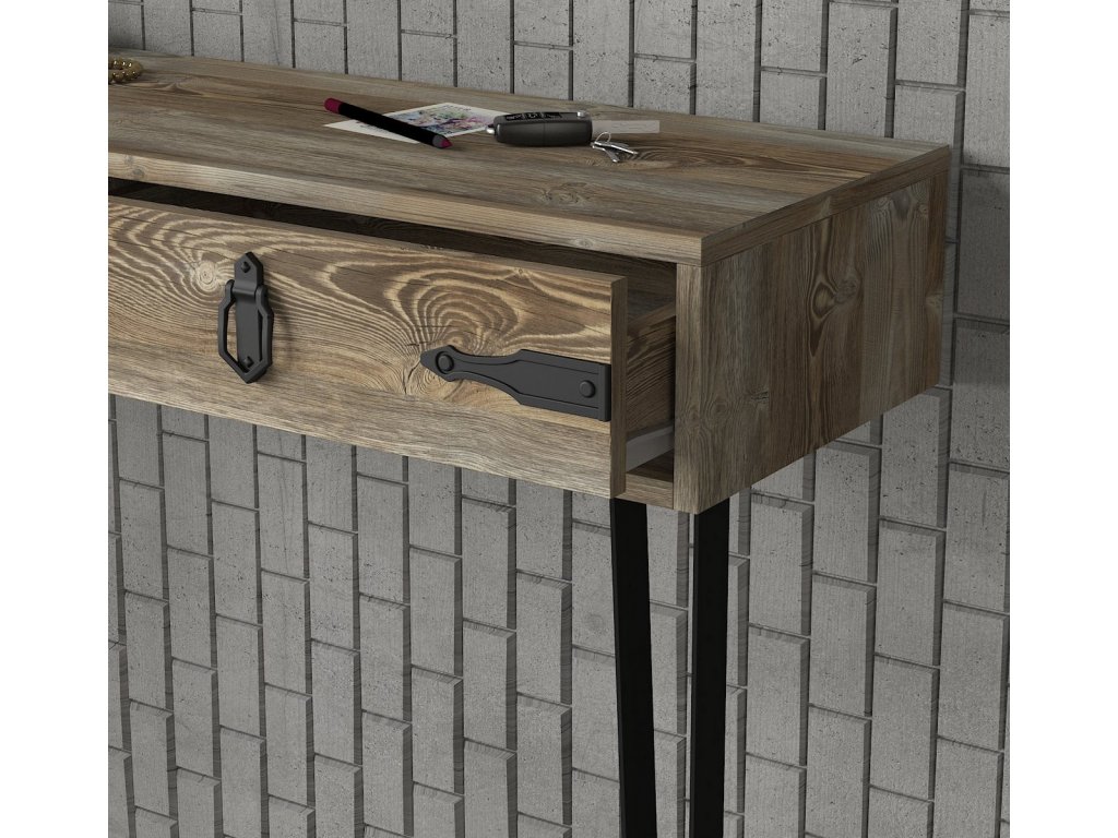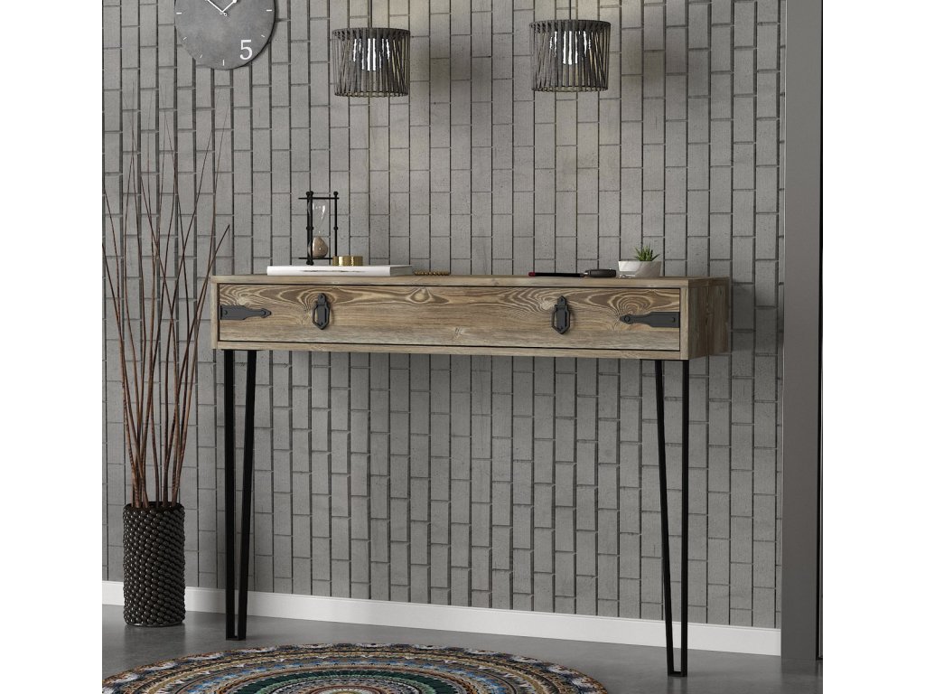 Konzolový - toaletní stolek se zásuvkou je vyroben z kvalitního lamina o tl.18 mm hraněné PVC páskou, odolného proti poškrábání v barvě patik. Lakované kovové nožky a úchyty jsou elegantně doplněny o kování, vše v barvě matná černá. Dodáváme v demontovaném stavu.Doplňkové parametry