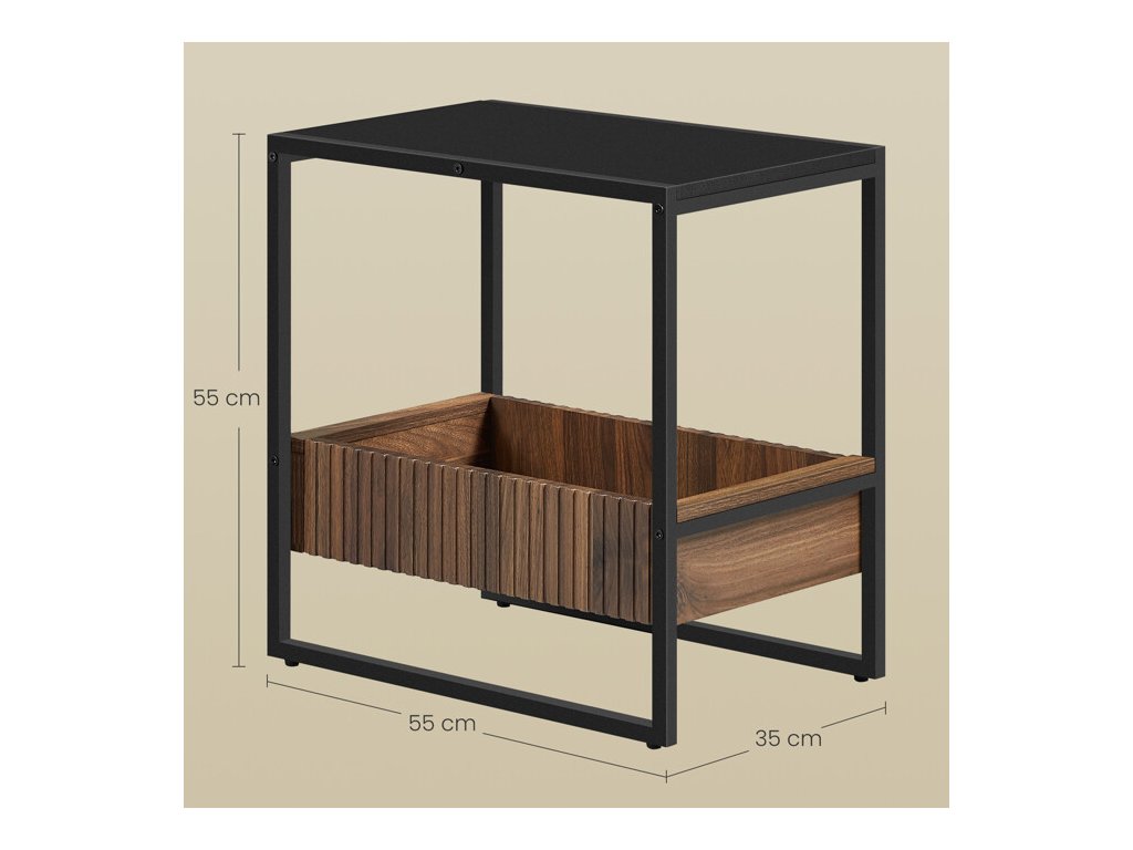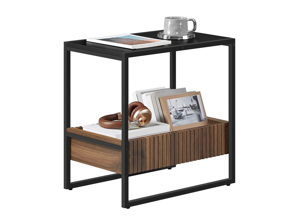 Odstavný stolek o rozměrech 55x35x56 cm kombinuje pevnou kovovou konstrukci v černé matné úpravě s praktickou odkládací plochou z MDF desky ve stejném odstínu. Součástí je úložný prostor s přírodní dřevěnou zásuvkou v dekoru ořech, která nabízí dostatek místa pro uložení drobných předmětů. Rektifikační nožky umožňují vyrovnání stolku na nerovném povrchu, čímž zajišťují stabilitu a bezpečné používání. Minimalistický design s kontrastem černé a přírodního dřeva se hodí do moderních i industriálně laděných interiérů.
