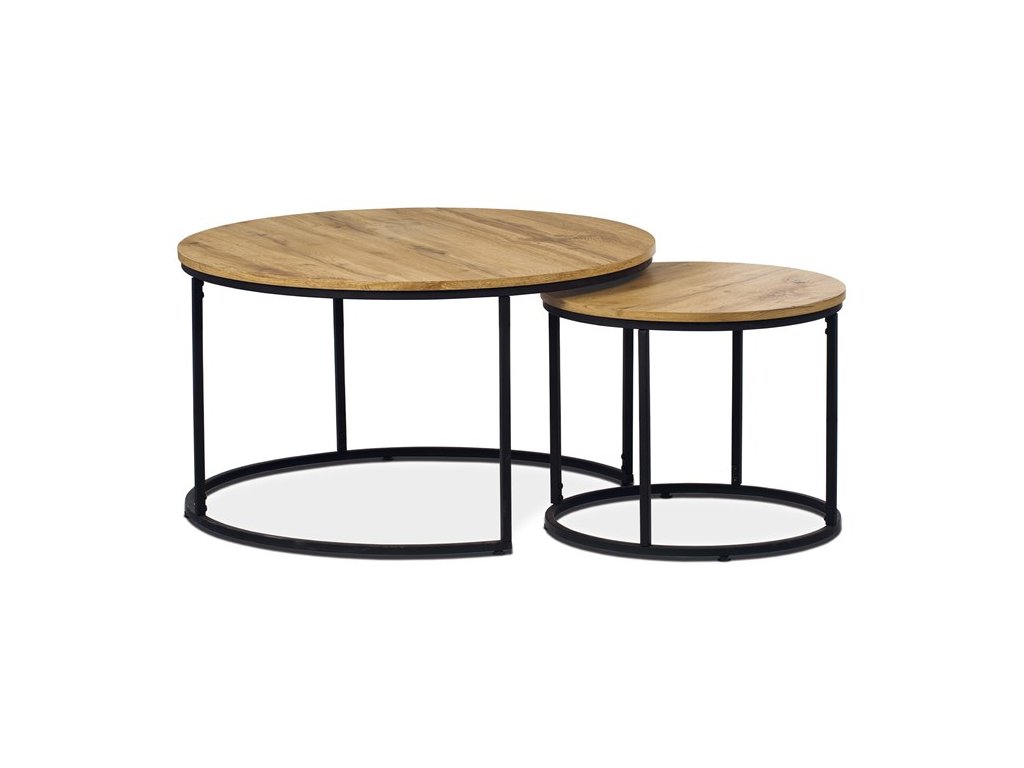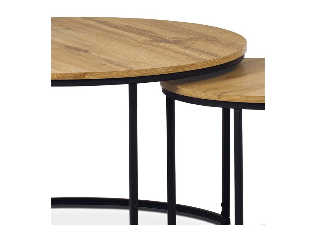 Set dvou konferenčních stolků kombinuje desky z MDF s dekorem divokého dubu a pevnou kovovou podnož v černém laku, která zajišťuje stabilitu a dlouhou životnost. Stolky mají kulatý tvar s hladce opracovanými hranami a rozdílnou výškou, což umožňuje jejich praktické uspořádání v prostoru, například zasunutí menšího stolku pod větší. Povrch desek je odolný vůči běžnému opotřebení a snadno se udržuje, což přispívá k jejich funkčnosti v moderních interiérech. Díky kombinaci přírodních odstínů hnědé a industriálního kovu se hodí do různých stylů zařízení od rustikálního po industriální. Rozměry a stabilní provedení umožňují využití stolů jako praktického doplňku obývacích pokojů či kanceláří. Menší stolek je s průměrem 50cm, výškou 40cm a světlou výškou 37cm.