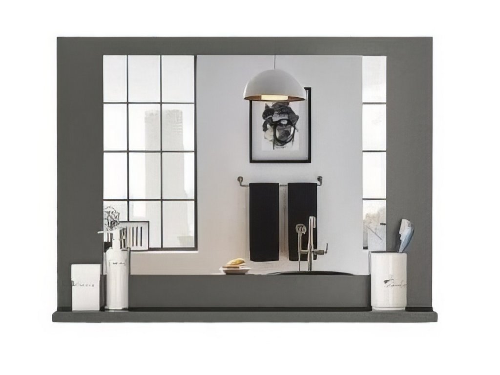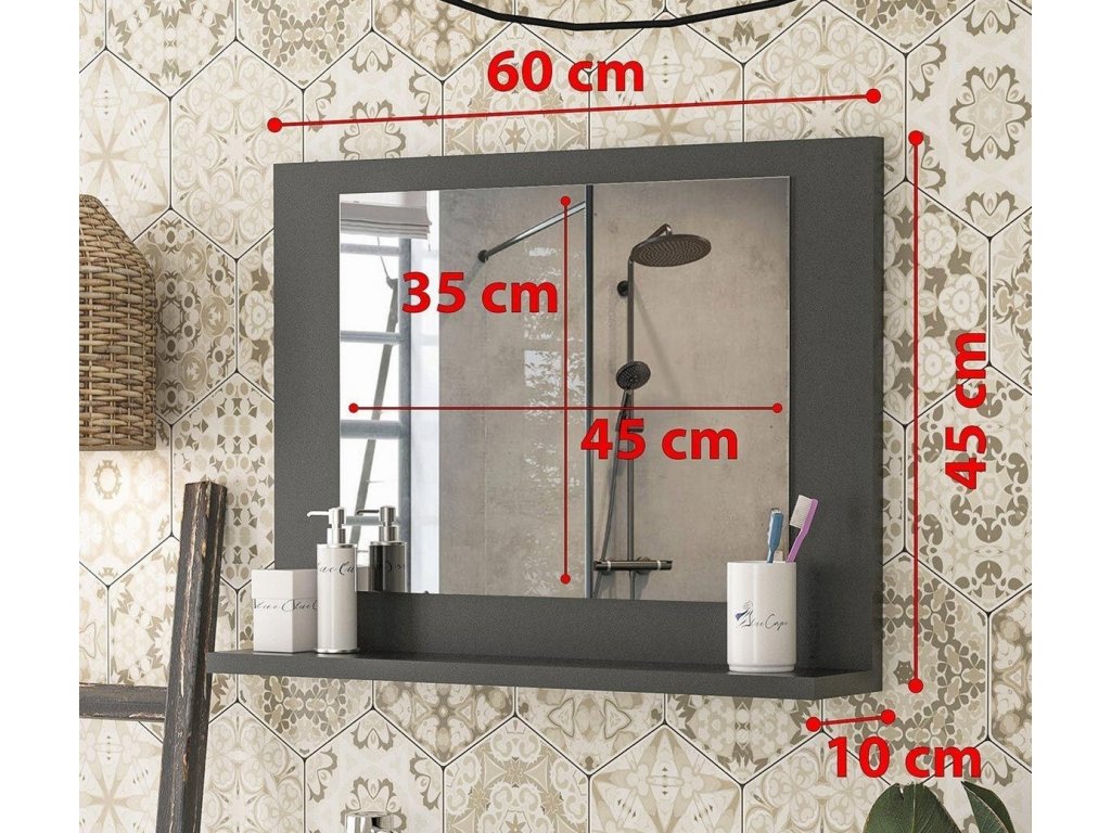 Závěsná police se zrcadlem je vyrobena z kvalitní desky LTD nenáročné na údržbu, v barevném provedení antracit. Tloušťka materiálu - 18 mm. Rozměry zrcadla: - šířka 45 cm - výška 35 cm. Rozměry police: - šířka 60 cm - hloubka 10 cm. Dodáváme v demontovaném stavu.Doplňkové parametry