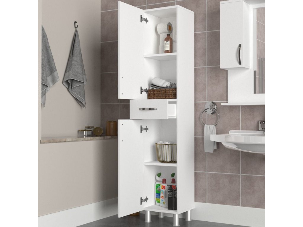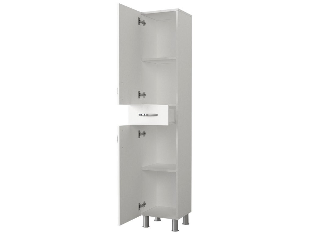 Vysoká skříňka do koupelny se dvěma dvířky a zásuvkou je vyrobena z kvalitního lamina o tl.18 mm hraněné PVC páskou, odolného proti poškrábání v barvě matná bílá. Dodáváme v demontovaném stavu.Doplňkové parametry