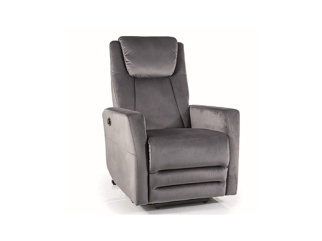 Rozkládací čalouněné křeslo. Rozložení křesla je elektrické (220 V). Jednoduchým pohybem uděláte pohodlnou pohovku s opěrkou pod nohy. Port USB. Čalounění je z látky velvet v šedé barvě (Bluvel 14). Celková hloubka křesla je 96 cm, po rozložení 162 cm. Hloubka sedu je 54 cm, výška sedu 49 cm. Pohodlí a elegance v kvalitním provedení ve Vašem obýváku, dětském pokoji či kanceláři.