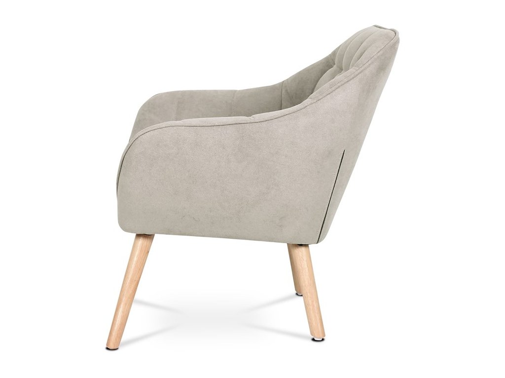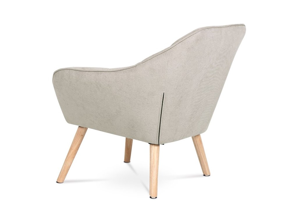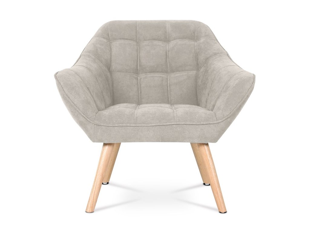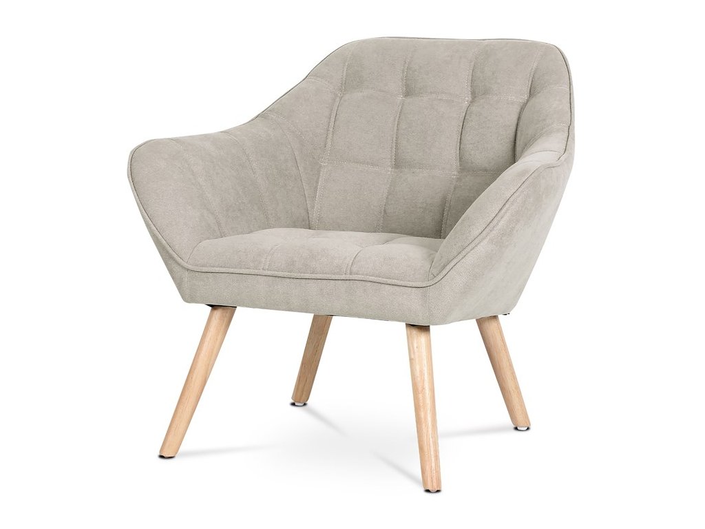 Křeslo s potahem ze šedobéžové látky nabízí příjemný komfort díky měkkému polstrování a designovému prošití, které dodává celku moderní vzhled. Masivní nohy z kaučukovníku zajišťují pevnou a stabilní oporu, přičemž jejich přírodní dřevěný odstín kontrastuje s jemným tónem čalounění. Ergonomicky tvarované opěradlo a široká sedací plocha podporují pohodlné posezení v obývacím pokoji či pracovně. Látkový potah je příjemný na dotek a snadno se udržuje, což přispívá k dlouhodobé použitelnosti. Křeslo je vhodné pro každodenní použití bez rozkládací funkce.