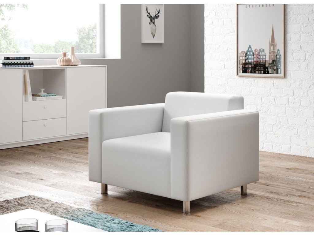 Praktické stylové křeslo vhodné do menších prostorů. Pohodlné sezení zaručují vlnovcové pružiny spolu s PUR pěnou. Výška sedáku je 40 cm, hloubka sedu je 54 cm. Nosnost křesla je 80 kg. Barevné provedení - Cayene 1115 (bílá ekokůže).