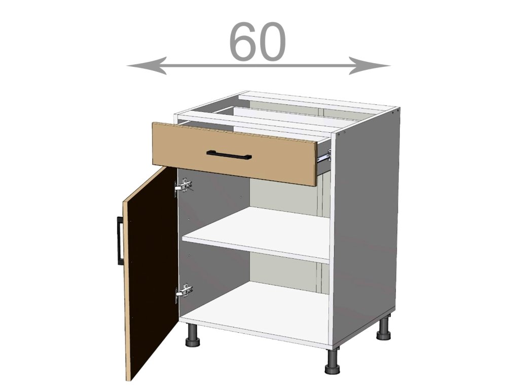 Dolní dvířková skříňka se zásuvkou KRAFTY je univerzálním prvkem kuchyňské sestavy a poskytuje praktický úložný prostor pro nádobí, potraviny nebo další kuchyňské potřeby. Díky svým kompaktním rozměrům ji snadno zkombinujete s ostatními dolními moduly a přizpůsobíte tak kuchyň přesně vašemu prostoru. Korpus skříňky je vyrobený z pevné 16mm desky pro stabilitu a dlouhou životnost. Dvířka jsou opatřena odolnou ABS hranou a doplněna moderním černým kovovým úchytem, který sjednocuje vzhled celé kolekce KRAFTY. Spodní skříňky jsou vybavené plastovými nožičkami o výšce 10 cm. Systém KRAFTY umožňuje volné kombinování skříněk, takže si můžete sestavit kuchyň přesně podle vlastních potřeb i dispozic místnosti. Sokl není součástí balení. Dodáváme v demontu.