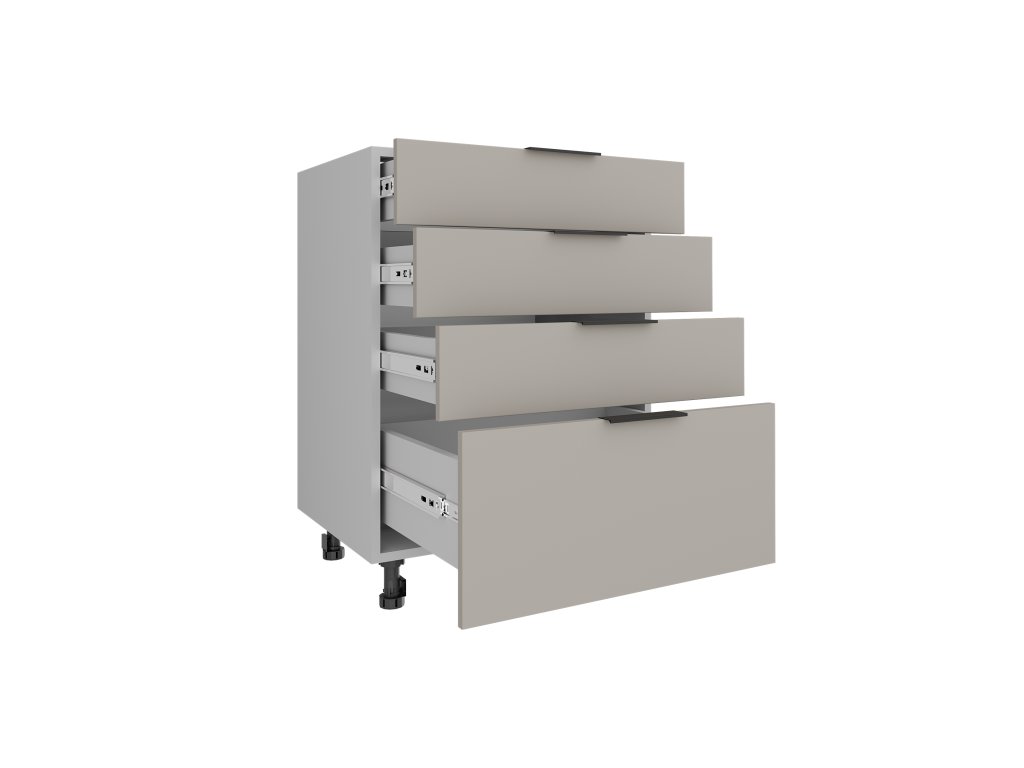 Dolní zásuvková skříňka KRAFTY nabízí přehledné uložení kuchyňských potřeb, příborů a náčiní. Kombinace více zásuvek umožňuje logické rozdělení prostoru, takže máte vše rychle po ruce a zároveň úhledně uklizené. Korpus skříňky je vyrobený z pevné 16mm desky a čela zásuvek mají odolnou ABS hranu, která chrání před nárazy a každodenním opotřebením. Moderní černé kovové úchyty sjednocují vzhled celé kuchyně KRAFTY a podtrhují její moderní charakter. Spodní skříňky jsou vybavené plastovými nožičkami o výšce 10 cm. Zásuvkovou skříňku lze snadno kombinovat s ostatními dolními, horními i vysokými moduly kolekce KRAFTY a vytvořit tak funkční a esteticky sladěnou kuchyň. Sokl není součástí balení. Dodáváme v demontu.