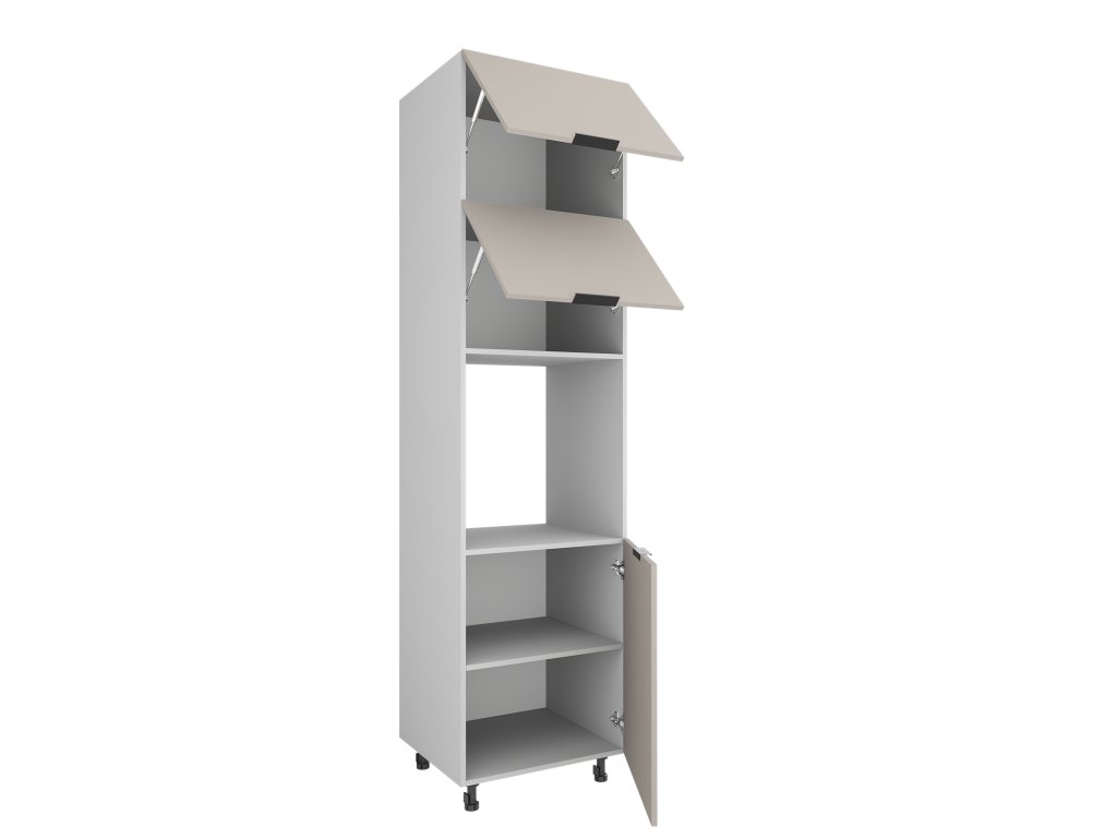 Potravinová skříň KRAFTY pro vestavnou troubu spojuje úložný prostor s možností umístění vestavného spotřebiče do ergonomické výšky. Střední část skříně je určená pro troubu, zatímco horní a dolní část nabízí dostatek místa na potraviny nebo kuchyňské vybavení. Korpus je vyrobený z pevné 16mm desky a dvířka mají odolnou ABS hranu. Moderní černý kovový úchyt sjednocuje vzhled se zbytkem kuchyně KRAFTY. Vysoké provedení skříně umožňuje využít prostor až ke stropu a zároveň mít troubu v pohodlné výšce. Tento modul je ideální kombinovat s horními skříňkami KRAFTY o výšce 92 cm, díky čemuž vzniká sladěná a vyvážená horní linie kuchyně. Skříň pro vestavnou troubu snadno zkombinujete s ostatními moduly kolekce KRAFTY a vytvoříte tak funkční a esteticky sladěnou kuchyň s vestavnými spotřebiči. Dodáváme v demontu.