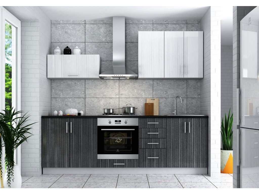 Dolní skříňka na vestavnou troubu vyrobená z kvalitního LTD. Barva korpusu je světle šedé barvy, spodní díl z MDF je v barvě titan černý lesk s dekorem. Rozměry skříňky - šířka 60 cm, výška 82 cm, hloubka 48 cm. Dodáváme v demontovaném stavu.