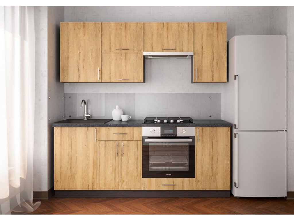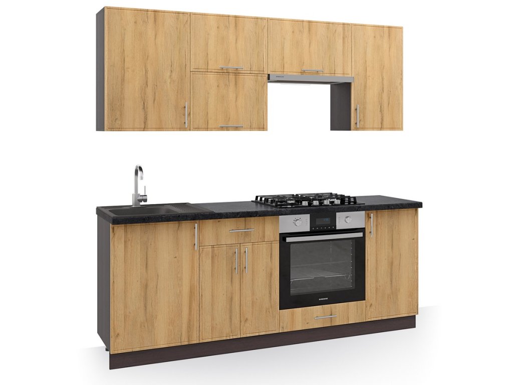 Tato moderní kuchyně kombinuje praktičnost a jednoduchý design. Skříňky se dají poskládat v libovolném pořadí a to Vám umožní si sestavit kuchyni podle svých představ. Korpus a sokl jsou z kvalitní LTD desky v barvě tmavé wenge, dvířka jsou z MDF v barvě dub wotan. Úchyty jsou stříbrné plastové. Sestava se skládá ze spodních skříněk - výška 82 cm, hloubka 47 cm, (s pracovní deskou výška 85 cm, hloubka 60 cm), šířka: - 50 cm skříňka pod dřez 1-dveřová - 50 cm skříňka 2-dveřová se zásuvkou - 40 cm skříňka 1-dveřová - 60 cm skříňka na vestavnou troubu - a vrchních skříněk - výška 72 cm, nad digestoří 36 cm, hloubka 32 cm, šířka: - 50 cm skříňka 1-dveřová - 50 cm skříňka 2-výklop - 40 cm skříňka 1-dveřová - 60 cm výklopná skříňka nad digestoř Kuchyně se prodává jako sestava, dokoupení skříněk není možné. Pracovní deska, spotřebiče, dřez a digestoř nejsou součástí kuchyně. Dřez a pracovní desky k zakoupení najdete v naší další nabídce. Dodáváme v demontovaném stavu.Doplňkové parametry