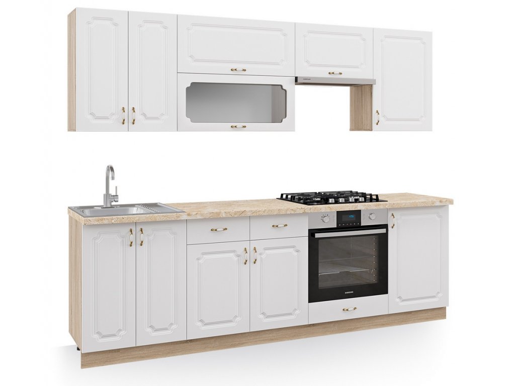 Tato moderní kuchyně kombinuje praktičnost a jednoduchý design. Skříňky se dají poskládat v libovolném pořadí a to Vám umožní si sestavit kuchyni podle svých představ. Korpus a sokl jsou z kvalitní LTD desky v barvě dub sonoma, dvířka jsou z MDF s ozdobným dekorem v barvě bílá v supermat. Úchyty jsou porcelánové provanského stylu. Zásuvky obsahují teleskopické výsuvy. Sestava se skládá ze spodních skříněk - výška 82 cm, hloubka 47 cm, (s pracovní deskou výška 85 cm, hloubka 60 cm), šířka: - 60 cm skříňka pod dřez 2-dveřová - 80 cm skříňka 2-dveřová se zásuvkami - 50 cm skříňka se 1-dveřová - 60 cm skříňka na vestavnou troubu - a vrchních skříněk - výška 72 cm, nad digestoří 36 cm, hloubka 32 cm, šířka: - 60 cm skříňka 2-dveřová - 50 cm skříňka 1-dveřová - 80 cm výklopná skříňka 2-dveřová (1x vitrína) - 60 cm výklopná skříňka nad digestoř Kuchyně se prodává jako sestava, dokoupení skříněk není možné. Pracovní deska, spotřebiče, dřez a digestoř nejsou součástí kuchyně. Dřez a pracovní desky k zakoupení najdete v naší další nabídce. Dodáváme v demontovaném stavu.Doplňkové parametry