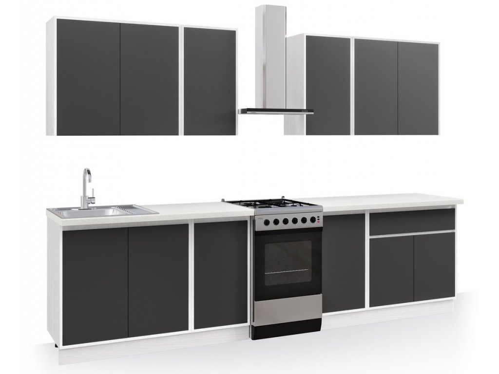 Tato moderní kuchyně kombinuje praktičnost a jednoduchý design. Skříňky se dají poskládat v libovolném pořadí a to Vám umožní si sestavit kuchyni podle svých představ. Korpus a sokl jsou z kvalitní LTD desky v barvě bílé, dvířka jsou v barvě antracit. Dvířka mají bezúchytový systém otvírání. Sestava se skládá ze spodních skříněk - výška 82 cm, hloubka 47 cm, (s pracovní deskou výška 85 cm, hloubka 60 cm), šířka: - 80 cm skříňka pod dřez 2-dveřová - 80 cm skříňka 2-dveřová se zásuvkou - 2x 40 cm skříňka 1-dveřová - a vrchních skříněk - výška 72 cm, hloubka 32 cm, šířka: - 2x 80 cm skříňka 2-dveřová - 2x 40 cm skříňka 1-dveřová Kuchyně se prodává jako sestava, dokoupení skříněk není možné. Pracovní deska, spotřebiče, dřez a digestoř nejsou součástí kuchyně. Dřez a pracovní desky k zakoupení najdete v naší další nabídce. Dodáváme v demontovaném stavu.Doplňkové parametry