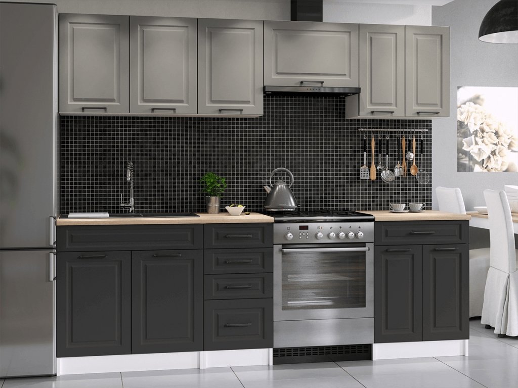 Kuchyňská linka Ilona je vyrobená ve venkovském stylu, který se hodí do kuchyně v paneláku i v rodinném domě. Tento styl má jedinečnou schopnost proměnit Vaši kuchyň v útulnou a zároveň funkční místnost, kde bude radost vařit i péct. Kuchyňská linka Ilona nabízí dostatek úložného i pracovního prostoru. Všechny skříňky jsou samostatné, takže si je můžete sestavit tak, jak Vám to vyhovuje. Korpusy skříněk jsou vyrobené z lamina 18 mm s hranami ABS a dvířka jsou MDF 16mm. Všechny skříňky jsou dodávány v demontu. Součástí balení je montážní plánek včetně všech potřebných spojovacích prvků. Cena je uvedna za sestavu vyobrazenou na úvodní fotografii BEZ PRACOVNÍ DESKY, s úchytkami, které jsou vyobrazeny v doplňkových fotografiích. Pracovní desku lze dokoupit nad každou skříňku zvlášť podle její šíře. Vyobrazené spotřebiče, dřez, baterie, doplňky a dekorace nejsou v ceně. Kuchyň bude dodaná s bílými korpusy a dvířky v kombinaci světle šedá a grafit.