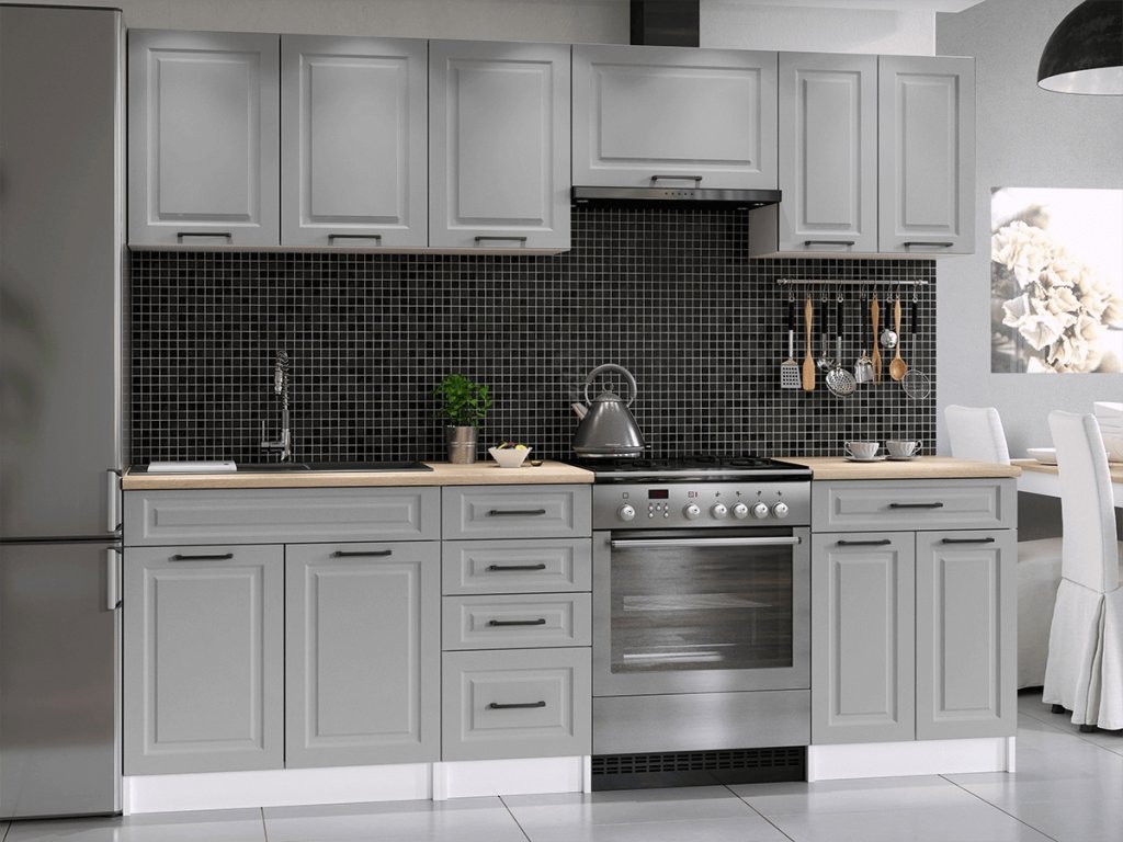 Kuchyňská linka Ilona je vyrobená ve venkovském stylu, který se hodí do kuchyně v paneláku i v rodinném domě. Tento styl má jedinečnou schopnost proměnit Vaši kuchyň v útulnou a zároveň funkční místnost, kde bude radost vařit i péct. Kuchyňská linka Ilona nabízí dostatek úložného i pracovního prostoru. Všechny skříňky jsou samostatné, takže si je můžete sestavit tak, jak Vám to vyhovuje. Korpusy skříněk jsou vyrobené z lamina 18 mm s hranami ABS a dvířka jsou MDF 16mm. Všechny skříňky jsou dodávány v demontu. Součástí balení je montážní plánek včetně všech potřebných spojovacích prvků. Cena je uvedna za sestavu vyobrazenou na úvodní fotografii BEZ PRACOVNÍ DESKY, s úchytkami, které jsou vyobrazeny v doplňkových fotografiích. Pracovní desku lze dokoupit nad každou skříňku zvlášť podle její šíře. Vyobrazené spotřebiče, dřez, baterie, doplňky a dekorace nejsou v ceně. Kuchyň bude dodaná s bílými korpusy a dvířky v šedém odstínu.