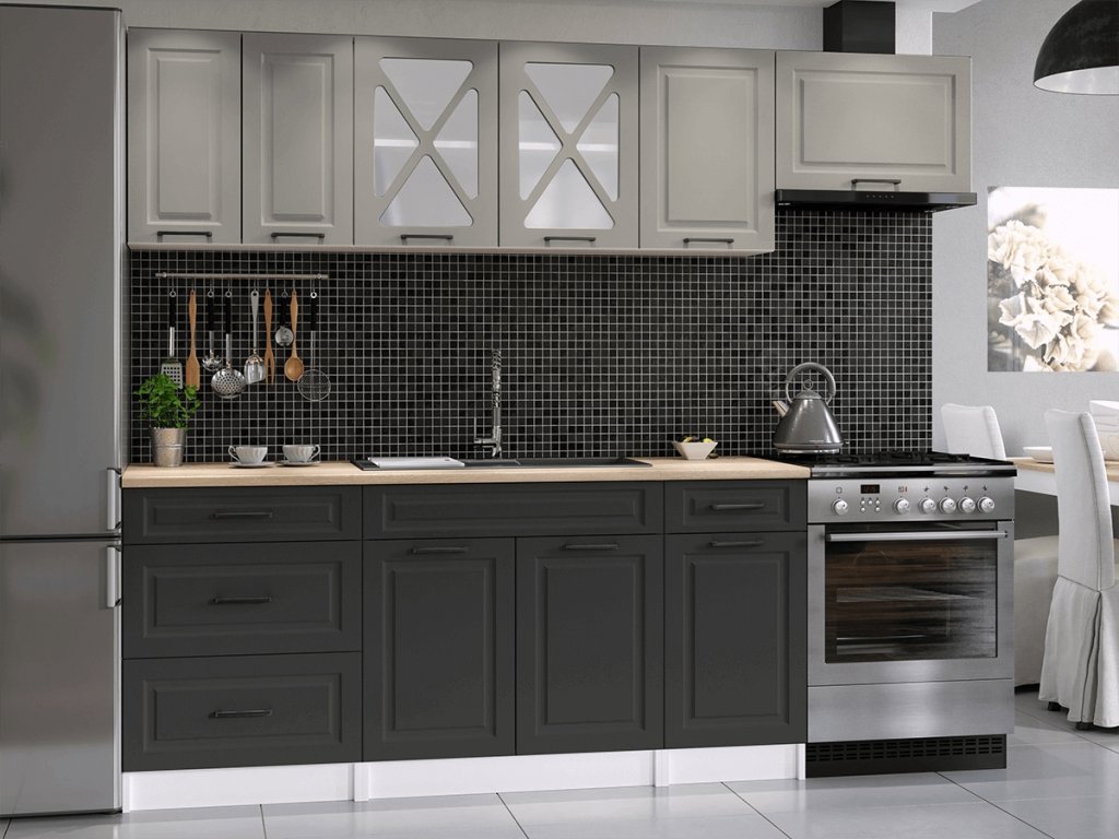 Kuchyňská linka Magda je vyrobená ve venkovském stylu, který se hodí do kuchyně v paneláku i v rodinném domě. Tento styl má jedinečnou schopnost proměnit Vaši kuchyň v útulnou a zároveň funkční místnost, kde bude radost vařit i péct. Kuchyňská linka Magda nabízí dostatek úložného i pracovního prostoru. Všechny skříňky jsou samostatné, takže si je můžete sestavit tak, jak Vám to vyhovuje. Korpusy skříněk jsou vyrobené z lamina 18 mm s hranami ABS a dvířka jsou MDF 16mm. Všechny skříňky jsou dodávány v demontu. Součástí balení je montážní plánek včetně všech potřebných spojovacích prvků. Cena je uvedna za sestavu vyobrazenou na úvodní fotografii BEZ PRACOVNÍ DESKY, s úchytkami, které jsou vyobrazeny v doplňkových fotografiích. Pracovní desku lze dokoupit nad každou skříňku zvlášť podle její šíře. Vyobrazené spotřebiče, dřez, baterie, doplňky a dekorace nejsou v ceně. Kuchyň bude dodaná s bílými korpusy a dvířky v odstínu kámen a grafit.