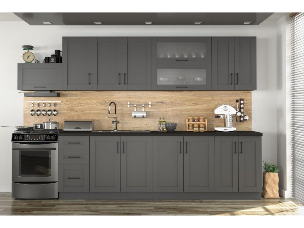 Kuchyně v barevném provedení antracit je vyrobena z desky LTD. Kuchyně je navržena tak, že skříňky se dají poskládat v libovolném pořadí. To vám umožní sestavit si kuchyni podle svých potřeb a představ. Úchyty jsou kovové v černé barvě. Pracovní deska, spotřebiče, dřez a digestoř nejsou součástí kuchyně. Sestava se skládá ze spodních skříněk - výška 82 cm, hloubka 44,5 cm, šířka: - 80 cm skříňka 2-dveřová pod dřez - 80 cm skříňka 2-dveřová - 60 cm skříňka 2-dveřová - 40 cm skříňka se 3 zásuvkami - a vrchních skříněk - výška 72 cm, hloubka 28,5 cm, šířka: - 80 cm skříňka 2-dveřová - 80 cm vitrína 2-výklopná - 60 cm skříňka 2-dveřová - 60 cm skříňka 1-výklopná nad digestoř - 40 cm skříňka 1-dveřová Kuchyně se prodává jako sestava, dokoupení skříněk není možné. Možnost dokoupení dřezu nebo pracovní desky. Dodáváme v demontovaném stavu.Doplňkové parametry