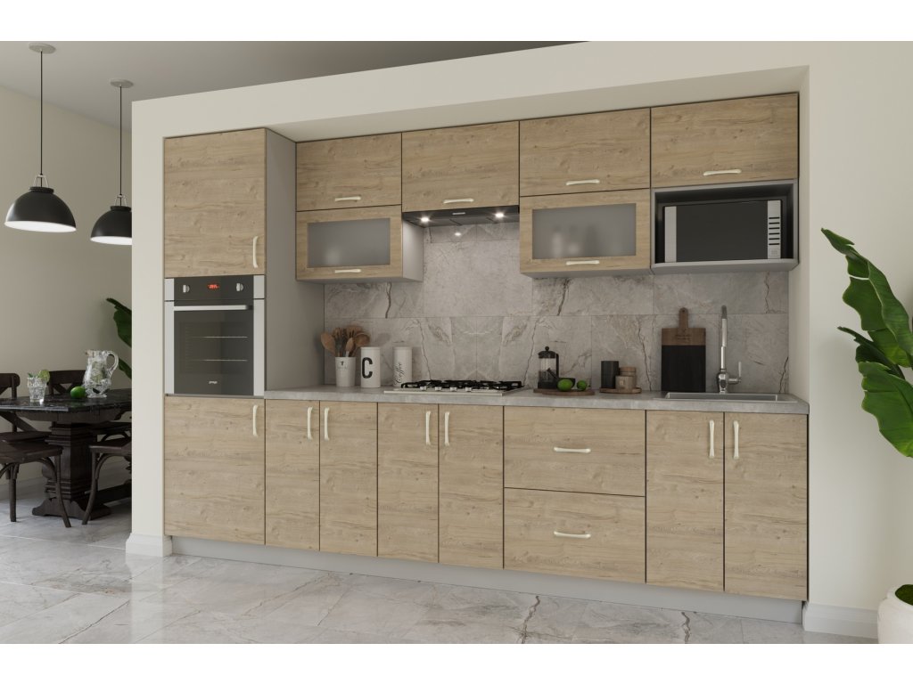 šířka: 260 cm | hloubka: 60 cm Kuchyňská linka 260 v jednoduchém stylu.Materiál LTD, korpus je v šedé barvě, dvířka jsou v barvě grey craft oak, úchyty jsou kovové, v černé...