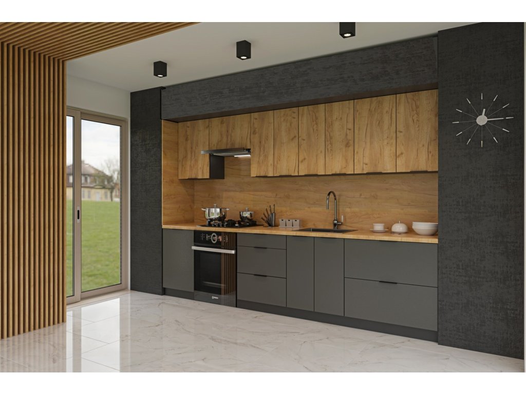 Elegantní kuchyňská sestava řady KRAFT v kombinaci zlatý dub / grafit s černými kovovými úchyty. Korpusy i dvířka jsou z 16 mm LTD s odolnou ABS hranou. Horní skříňky s vertikálním otevíráním jsou vybaveny plynovými písty. Skříňky lze snadno uspořádat libovolně podle prostoru.