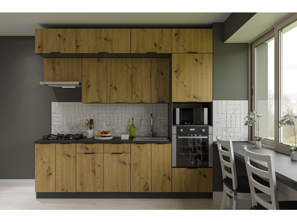 Kuchyňské skříňky jsou vyrobeny z kvalitních LTD desek. Jejich údržba je nenáročná. Korpus je v šedé barvě. Dvířka jsou v barvě dub Artisan. Kovové úchyty v černé barvě jsou součástí sestavy.