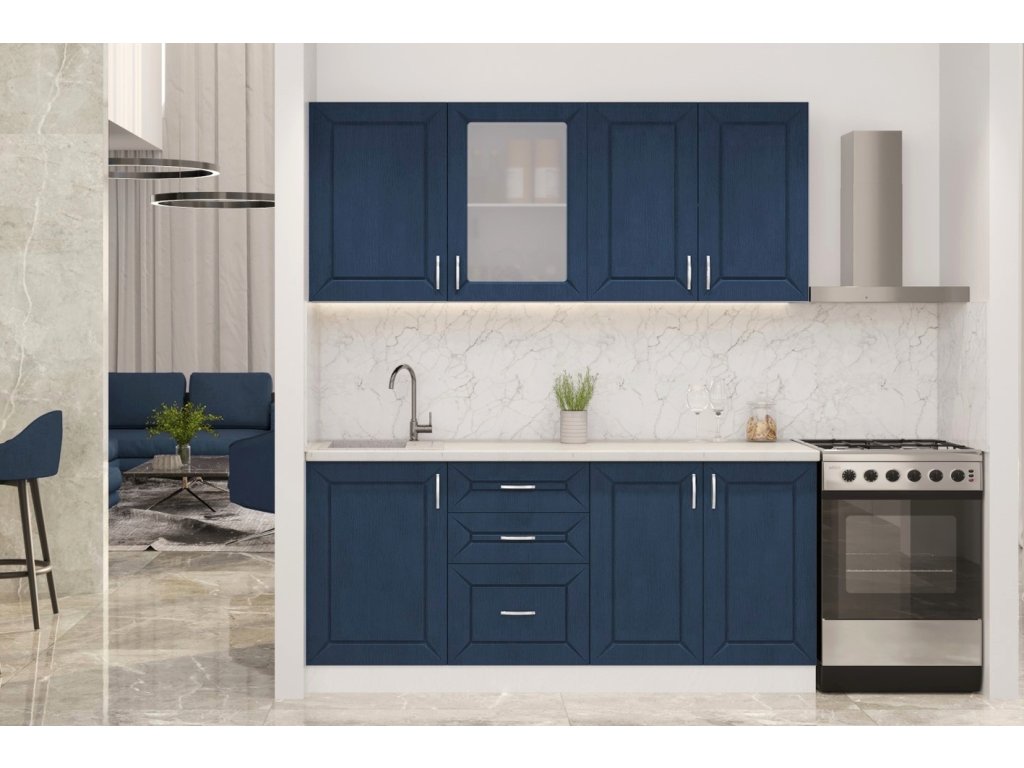 Tato moderní kuchyně kombinuje praktičnost a jednoduchý design. Skříňky se dají poskládat v libovolném pořadí a to Vám umožní si sestavit kuchyni podle svých představ. Korpus a sokl jsou z kvalitní LTD desky v barvě bílá strukturální, dvířka jsou z desky MDF tl. 16 mm v barvě safírová s jemnou texturou dřeva. Úchyty jsou pochromované. Sestava se skládá ze spodních skříněk - výška 82 cm, hloubka 47 cm, (s pracovní deskou výška 85 cm, hloubka 60 cm), šířka: - 50 cm skříňka se třemi zásuvkami - 50 cm skříňka 1-dveřová pod dřez - 80 cm skříňka 2-dveřová a vrchních skříněk - výška 72 cm, hloubka 32 cm, šířka: - 50 cm skříňka 1-dveřová - 50 cm vitrína 1-dveřová - 80 cm skříňka 2-dveřová Kuchyně se prodává jako sestava, dokoupení skříněk není možné. Pracovní deska, spotřebiče, dřez a digestoř nejsou součástí kuchyně. Dřez a pracovní desky k zakoupení najdete v naší další nabídce. Dodáváme v demontovaném stavu.Doplňkové parametry