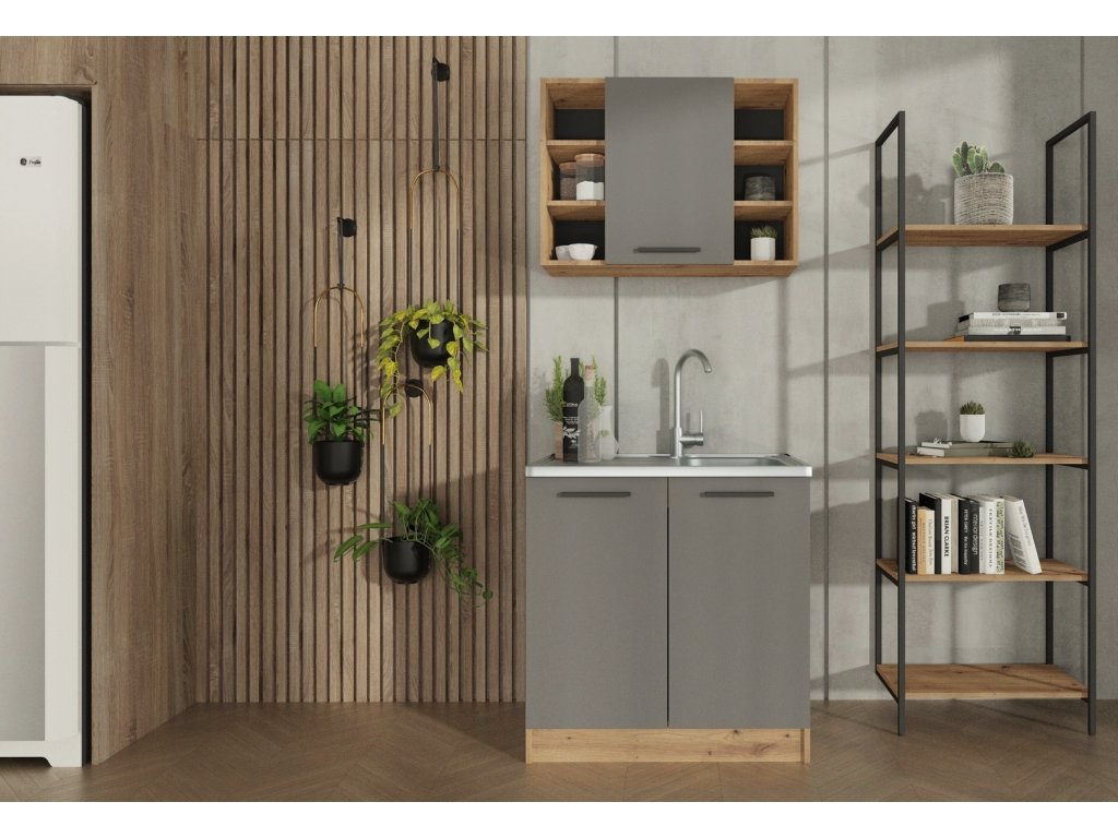 Moderní levná kuchyně. Korpus a sokl jsou v barvě dub artisan, dvířka v barvě šedé. Spotřebiče, dřez a digestoř v ceně nejsou. Dřez k zakoupení najdete v naší nabídce. Sestava se skládá ze spodních skříněk - výška 82 cm, hloubka 46 cm, šířka: - 80 cm skříňka 2-dveřová pod dřez bez pracovní desky a vrchní skříňky: - šířka 80 cm skříňka 1-dvéřová po stranách s regálem, výška 58 cm, hloubka 30 cm. Tato sestava se prodává pouze jako celek, dokoupit jednotlivé skříňky není možné. Dodáváme v demontovaném stavu.Doplňkové parametry
