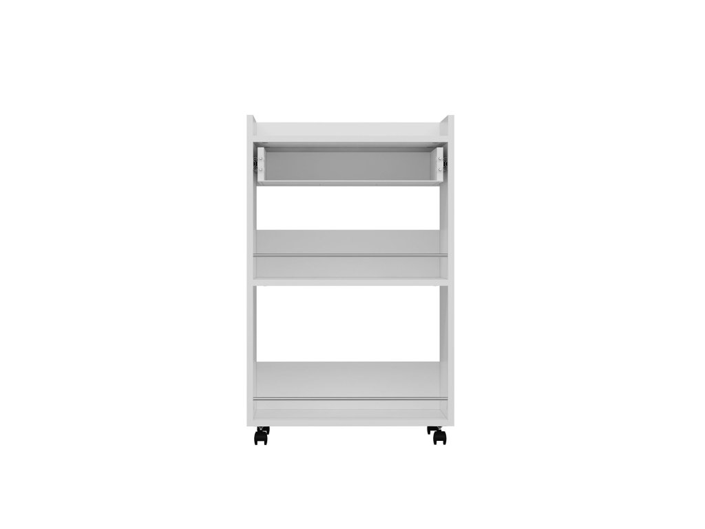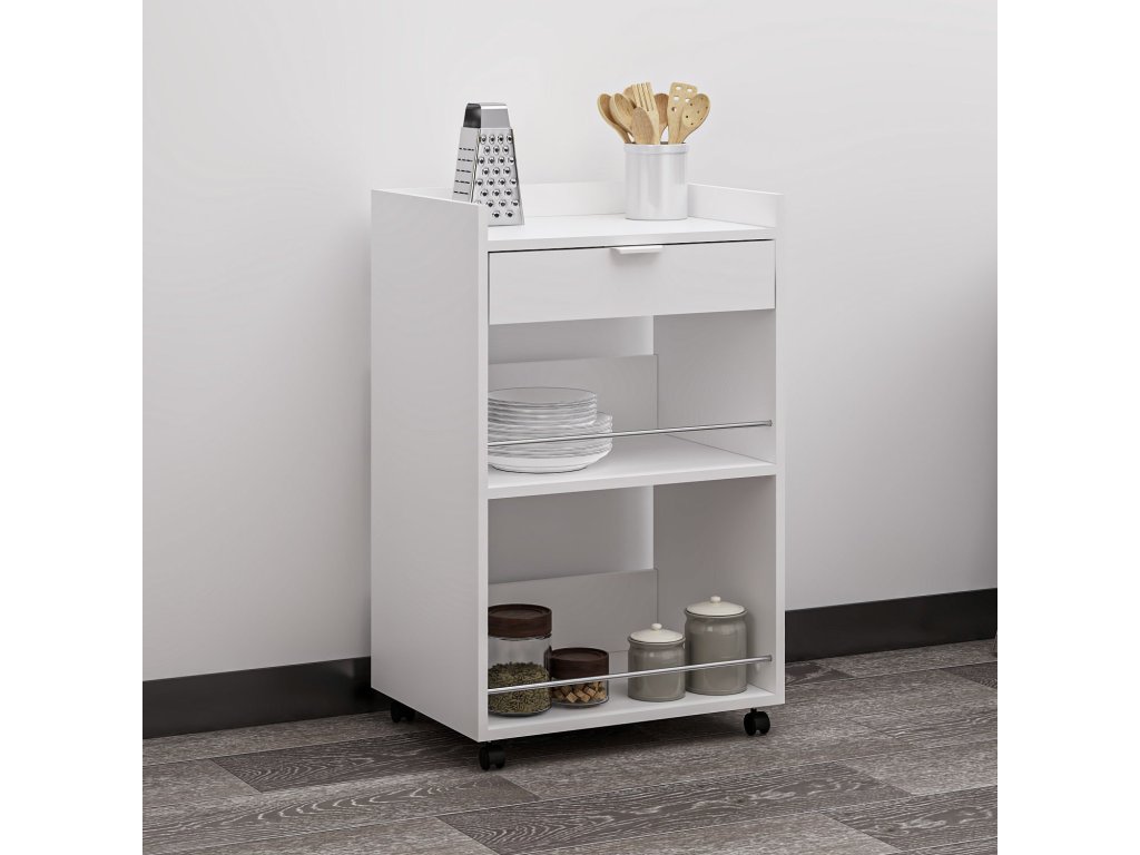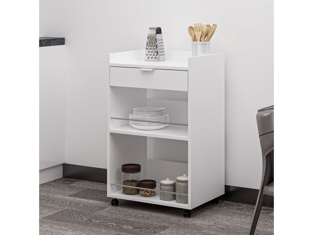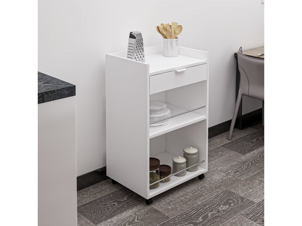 Regál na kolečkách je elegantní a víceúčelový kus nábytku, který skvěle zapadne do moderní kuchyně nebo obývacího pokoje. Jeho skandinávský design v bílé barvě nabízí čistý a minimalistický vzhled, zatímco zásuvka a odkládací police zajišťují dostatek úložného prostoru pro vaše potřeby.