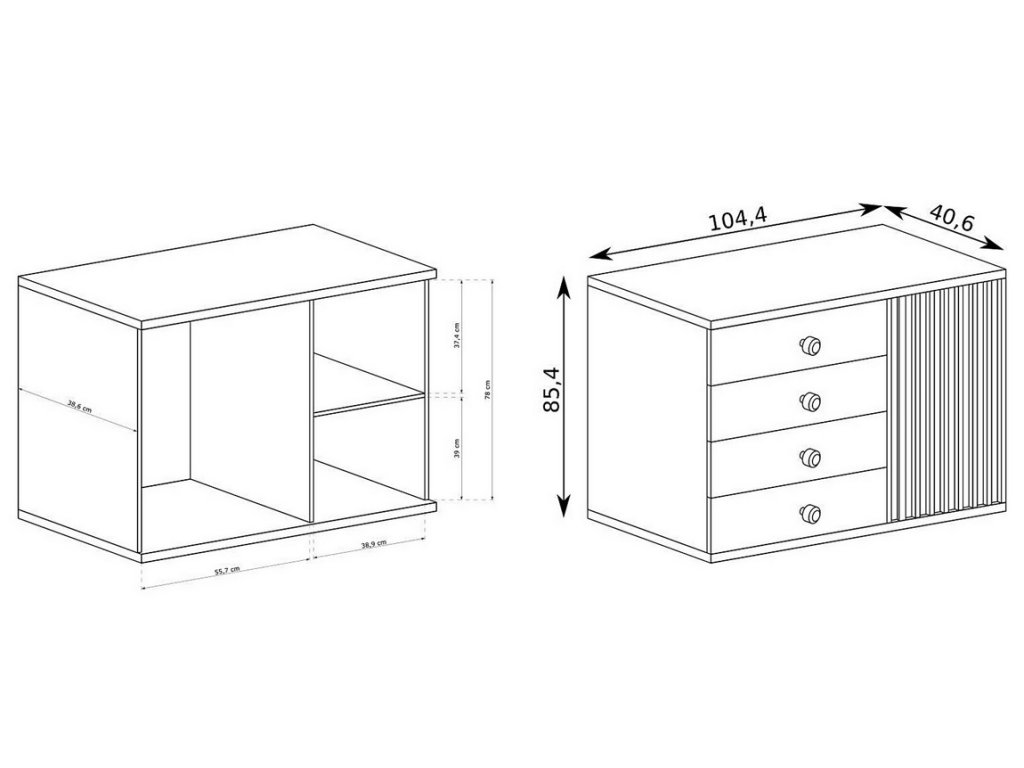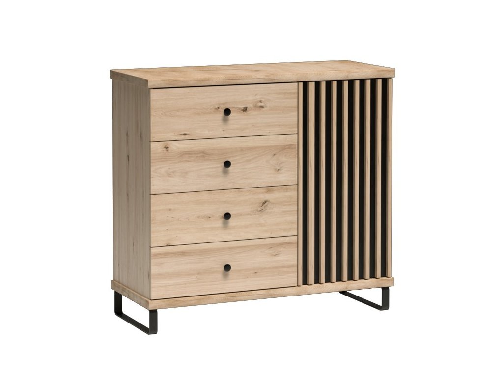 Komoda jednodveřová se čtyřmi zásuvkami s netradičním provedením detailu dvířek s lamelami. Kolekce nábytku v sobě spojuje jednoduchost, originální vzhled a funkčnost. Barevné provedení je v kombinaci dub artisan/černá mat. Nábytek je vyroben z kvalitního lamina ohraničeného ABS páskou, dekorační lamely jsou vyrobeny z desky MDF. Zásuvky jsou vybaveny kovovými pojezdy se systémem tichého dovírání. Kolekce se skládá z mnoha prvků a tento široký výběr Vám zaručí sestavit si nábytek podle svých vlastních představ a přání. Dodáváme v demontovaném stavu.Doplňkové parametry